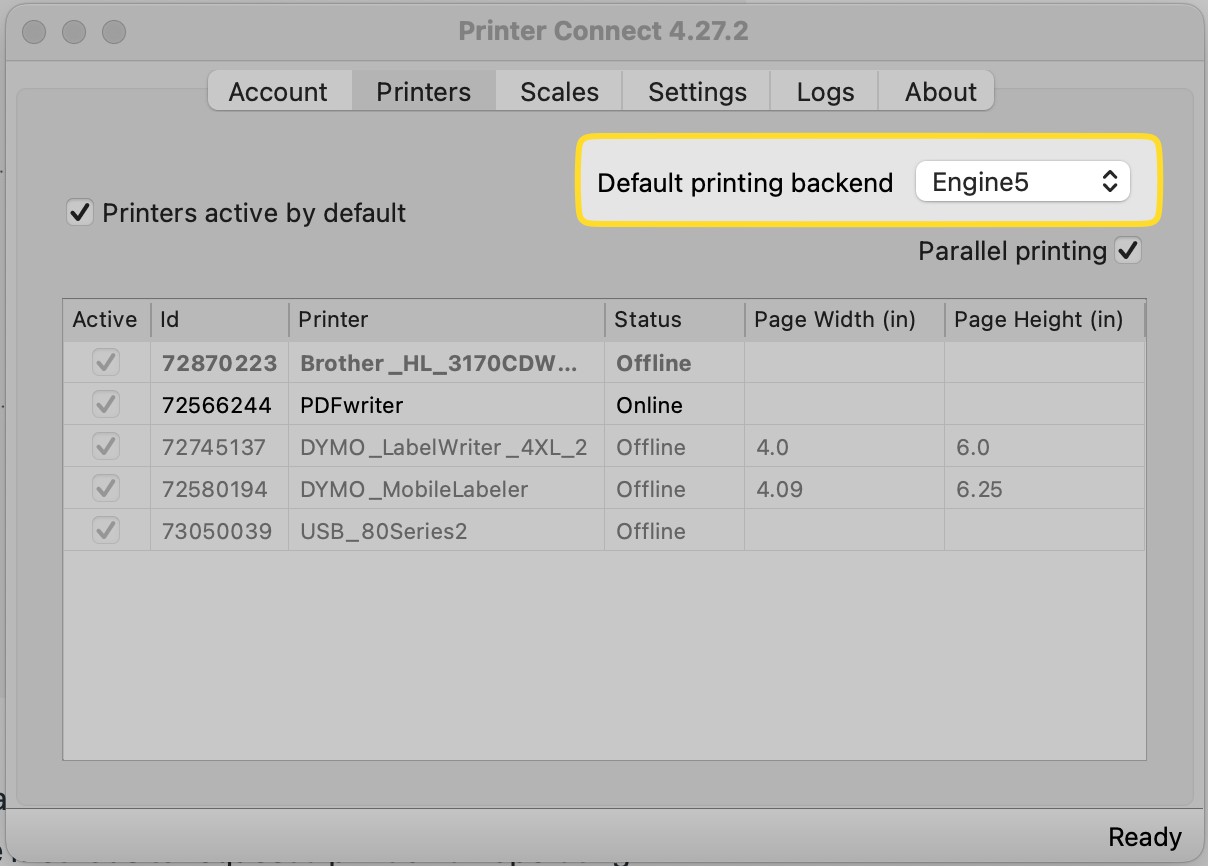 If Koi Printer Connect has been successfully logged in but you are unable to print from your computer, consider modifying the Print Engine Version within Koi Printer Connect.