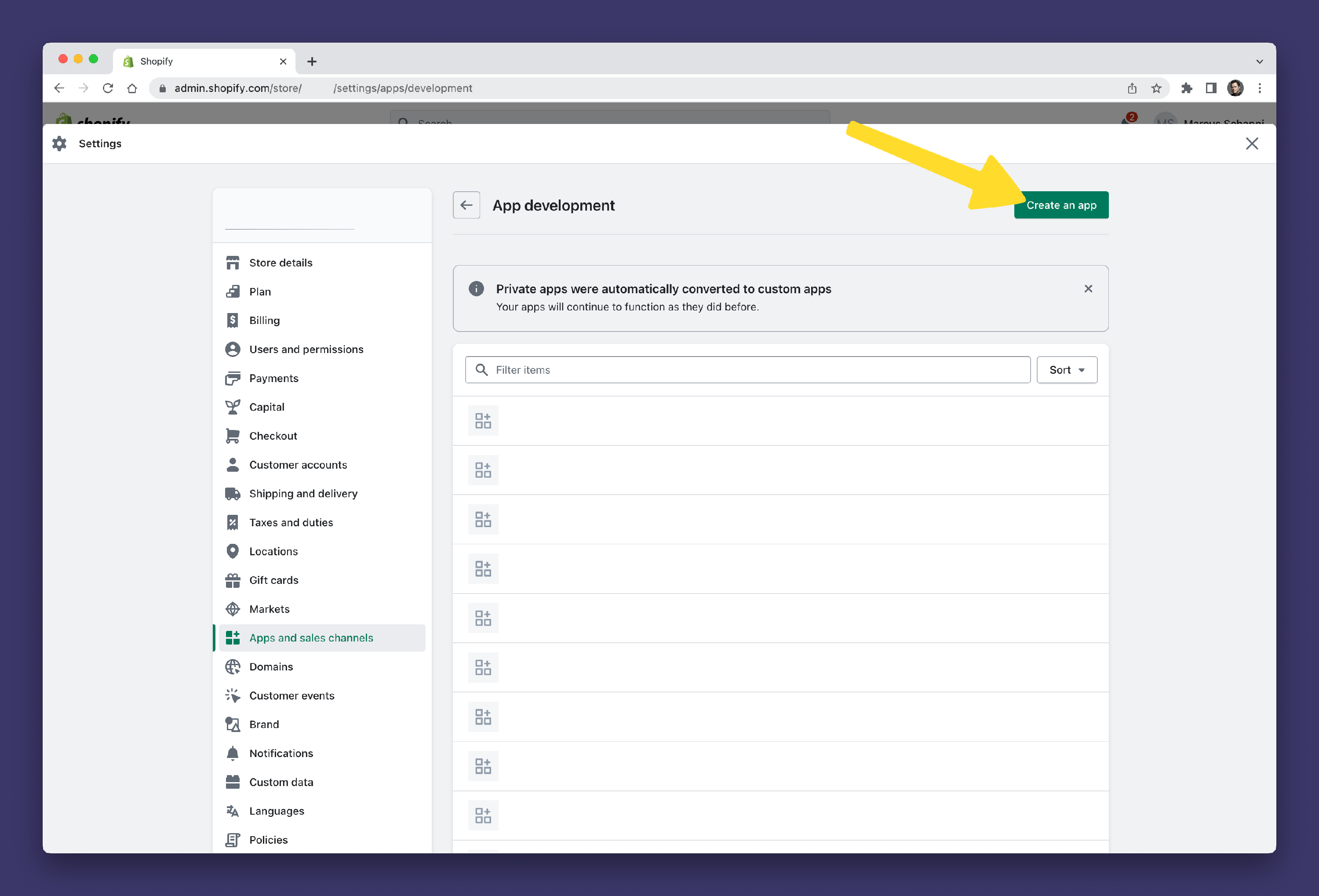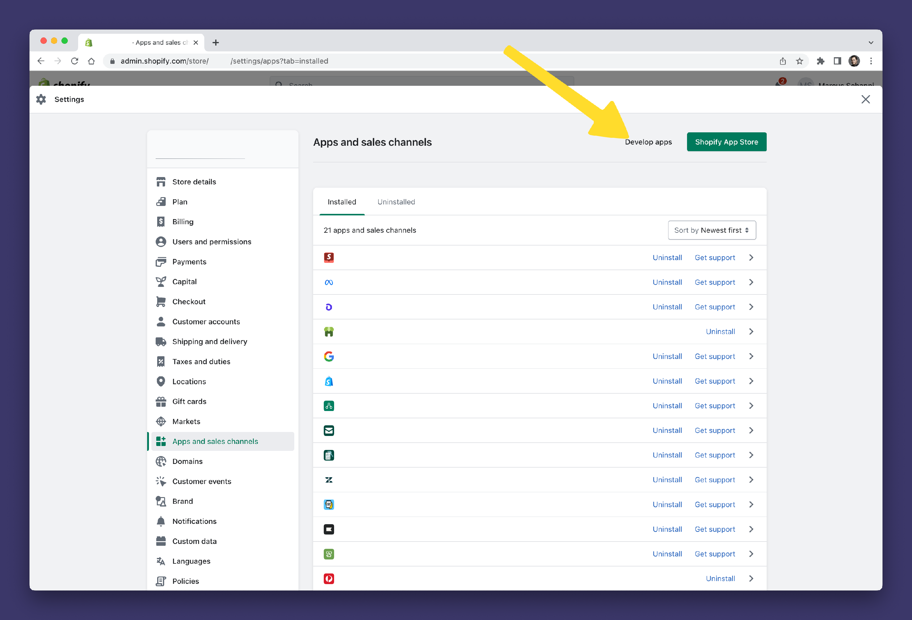 - Click the App and sales channel settings button at the bottom of the menu