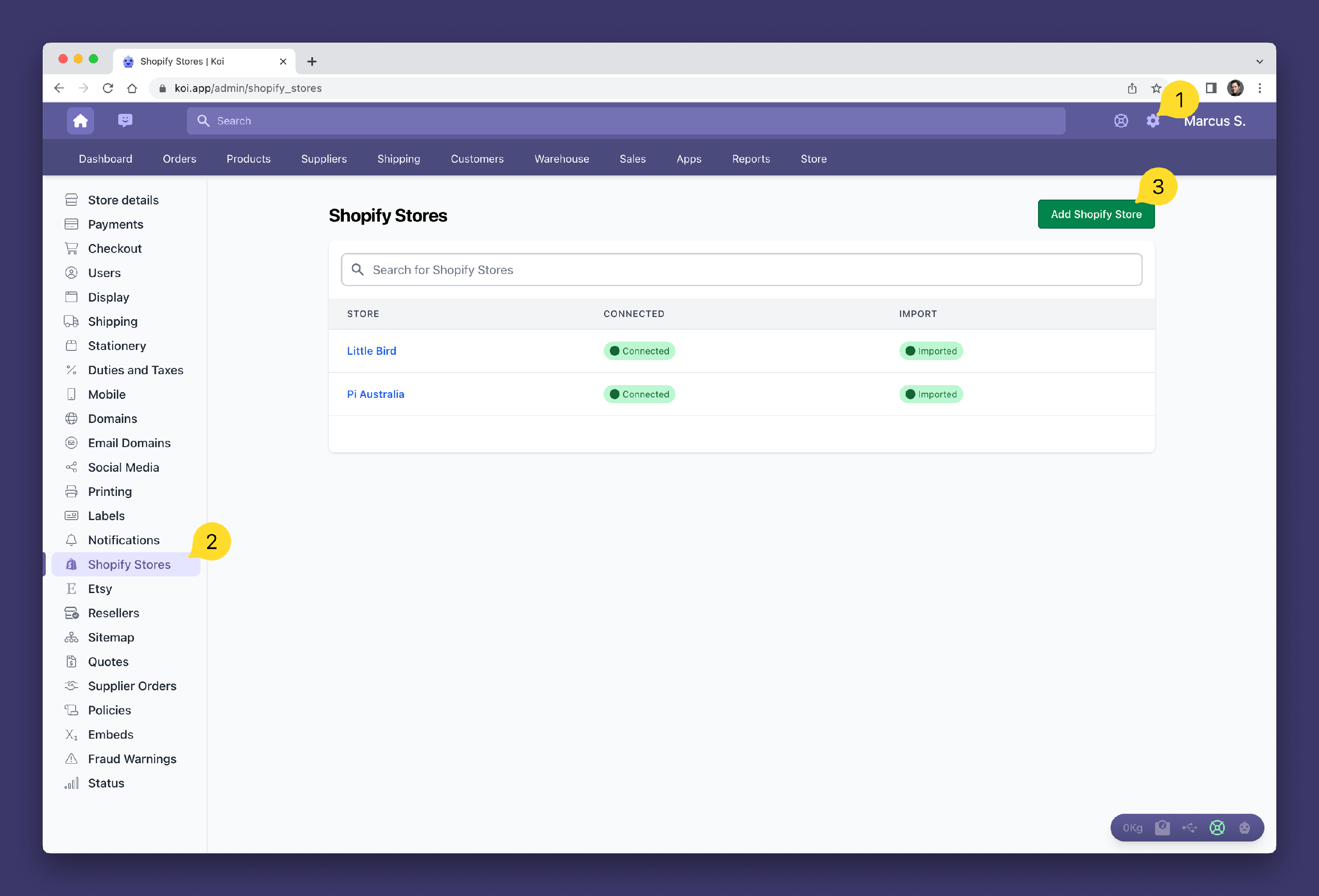 - Add a new Shopify Store by clicking the Add Shopify Store 3️⃣ button