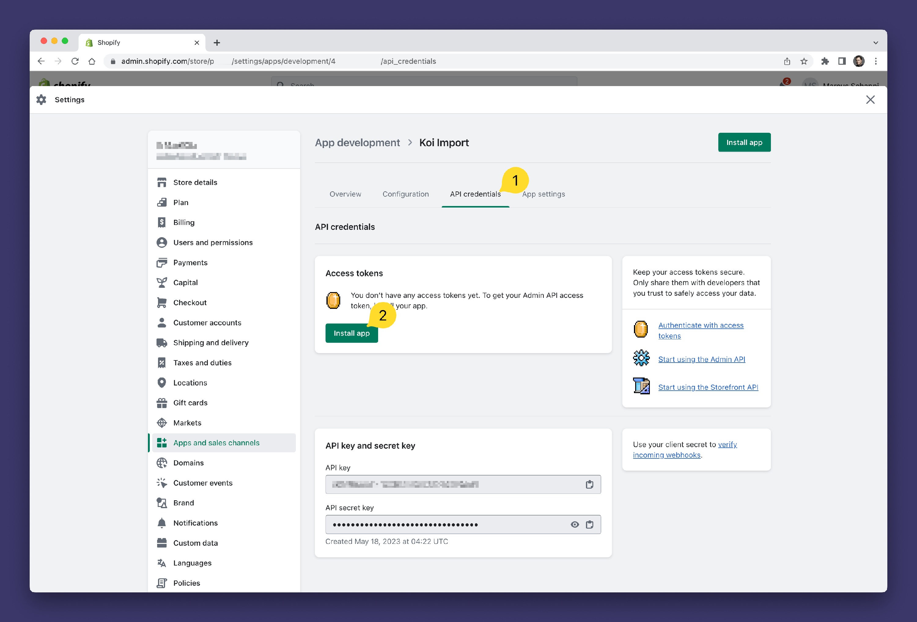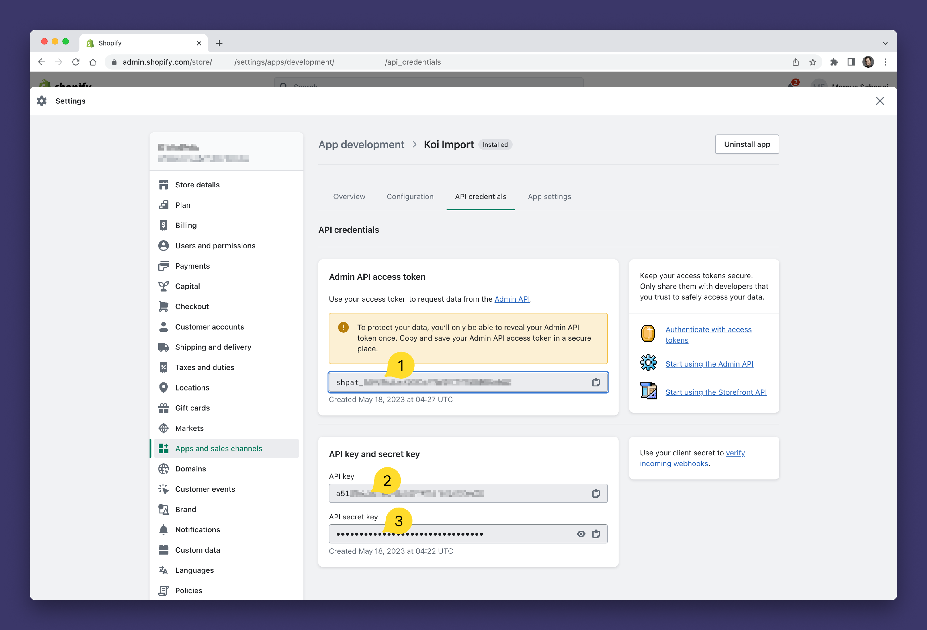 - Copy the Admin API access token 1️⃣, API key 2️⃣ and API secret key 3️⃣ for later use in Koi