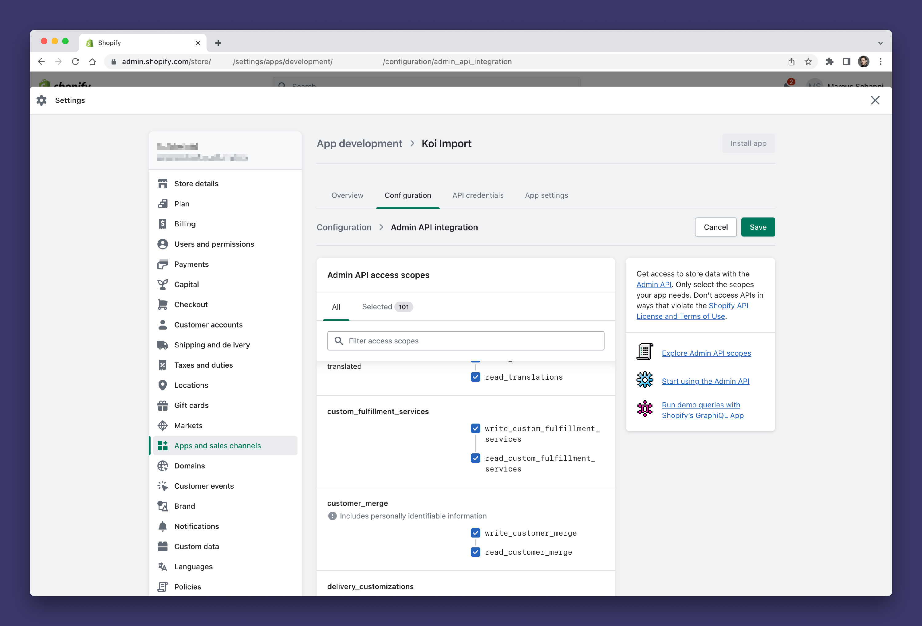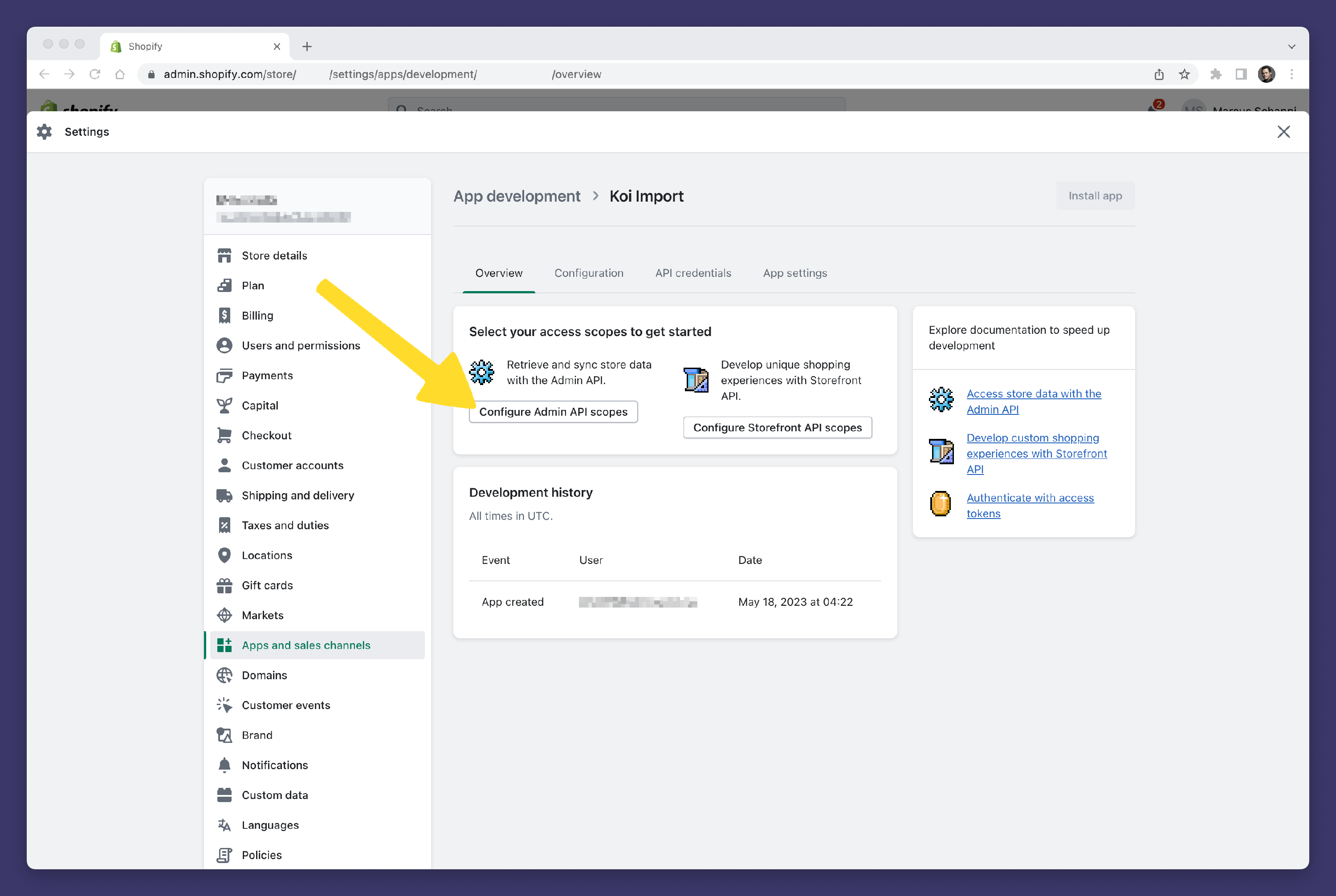 - Click the Configure Admin API scopes button