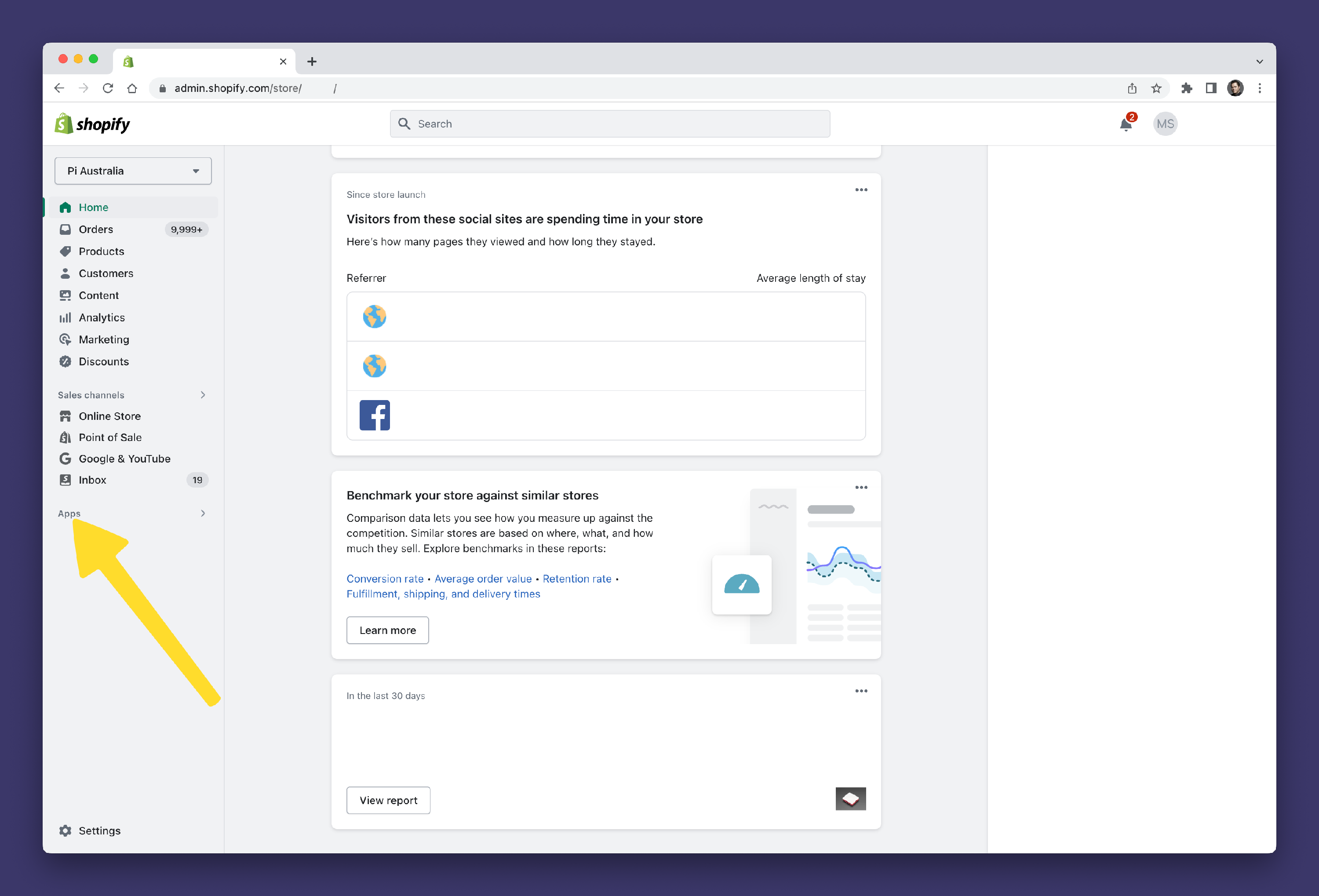 - Go to Shopify Stores settings by clicking on the Shopify Stores 2️⃣ link