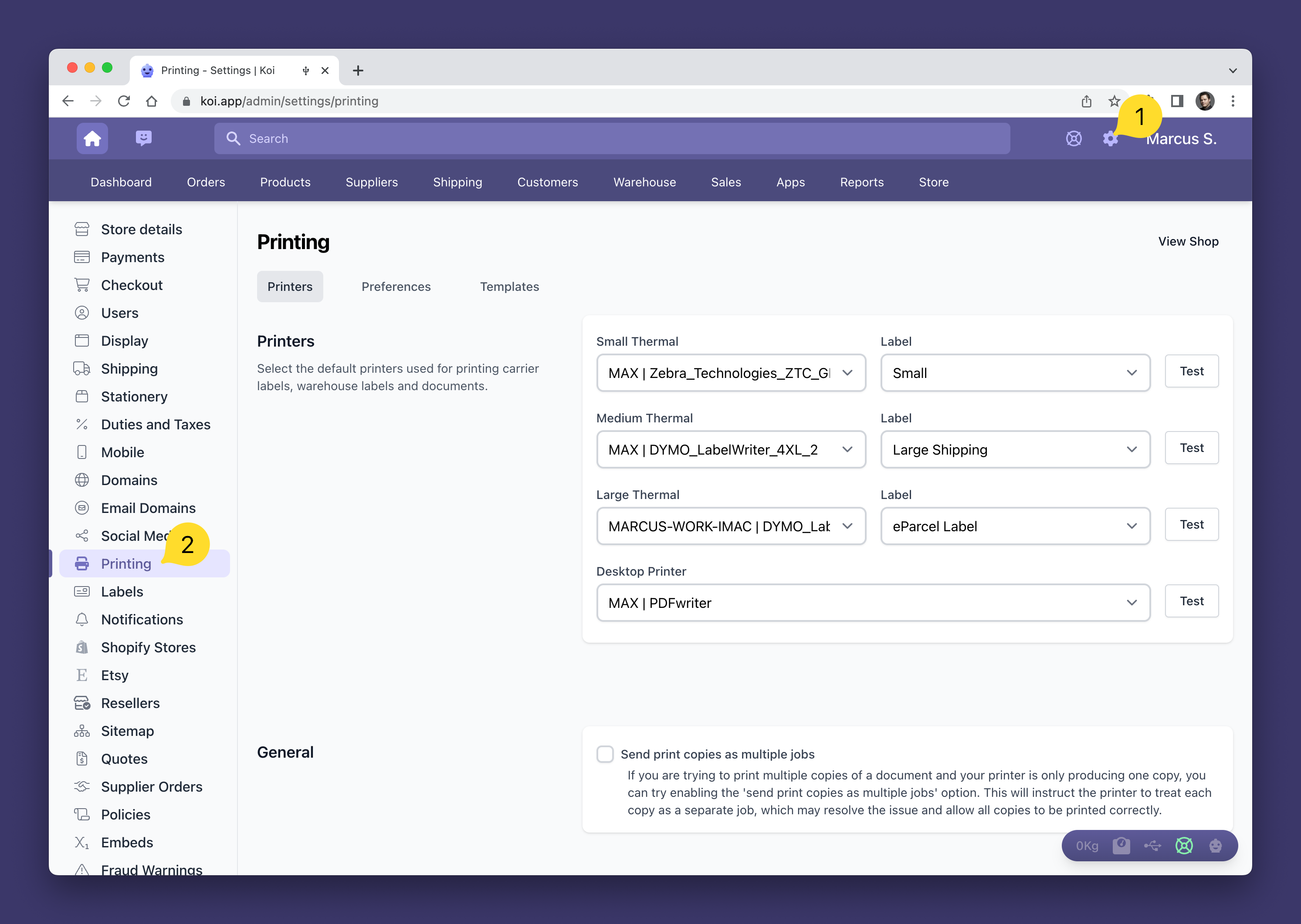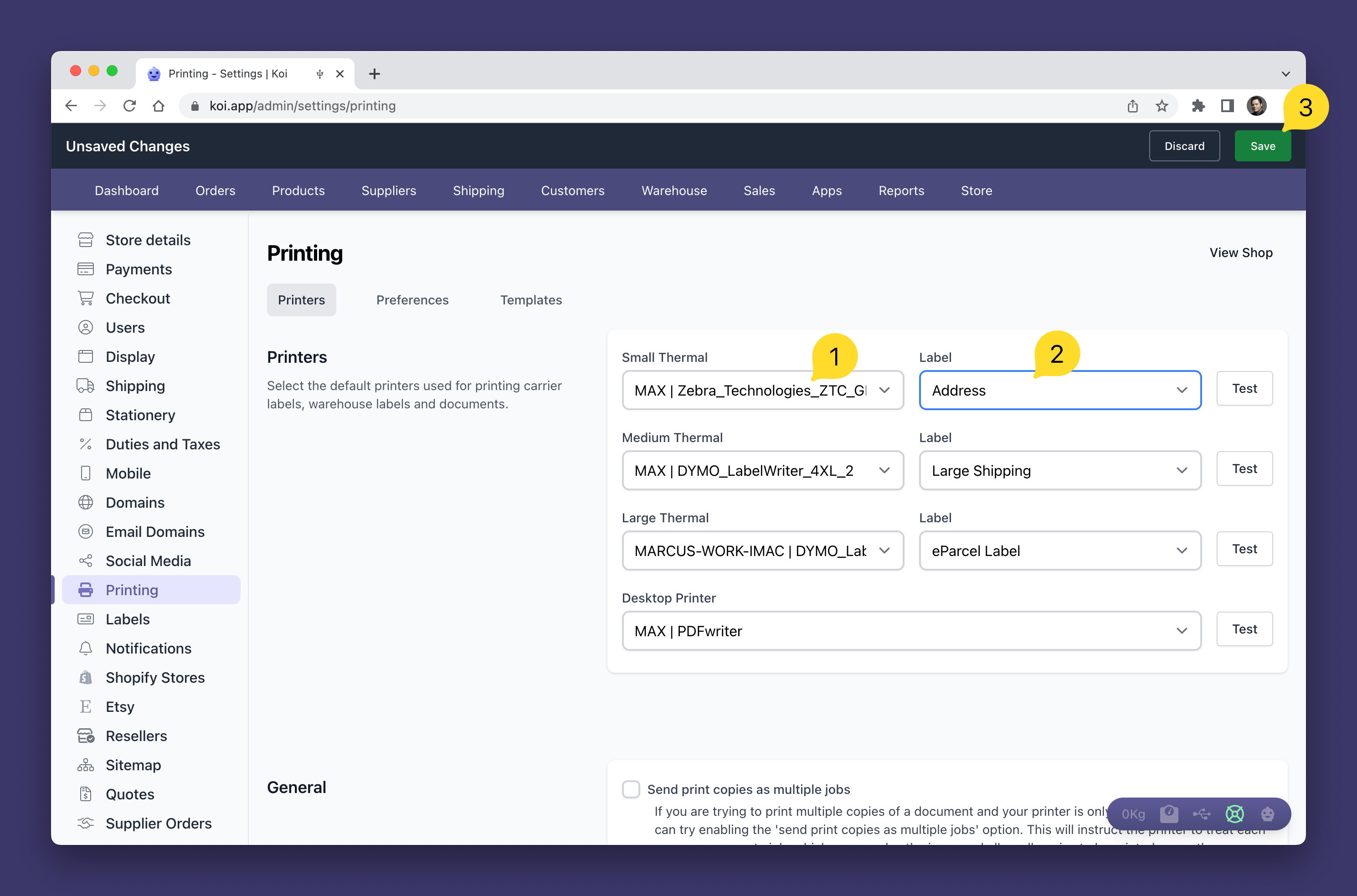 On this page, you can tell Koi which printer to use for what and what label media the printer is using. Koi segments your printers into: "Small Thermal" for printing product labels and warehouse location barcodes; "Medium Thermal" for printing manual shipping address labels (e.g. the kind of address label you'd find on a letter); "Large Thermal" for printing carrier shipping labels; and "Desktop Printer" for printing Pick/Pack Slips, Quotes and Tax invoices.