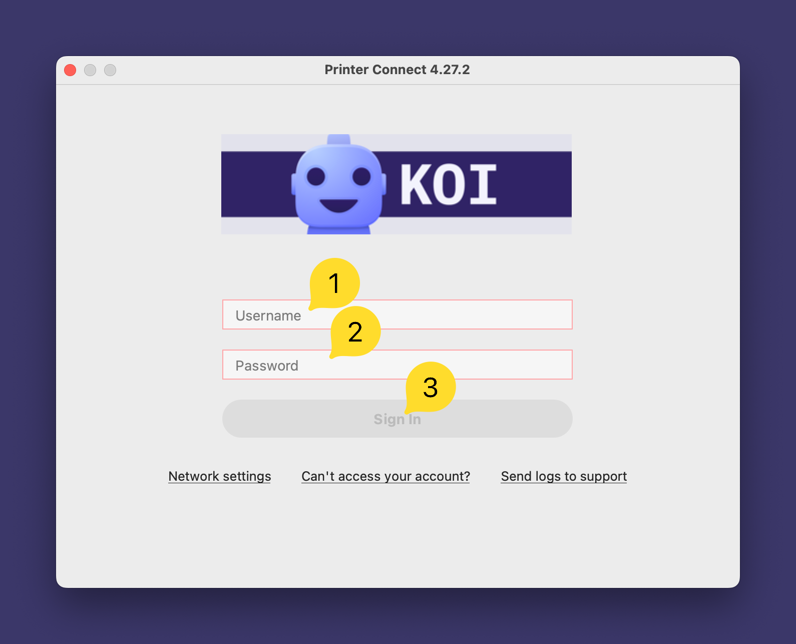Once you have installed the Koi Printer Connect, you will be asked to log in.