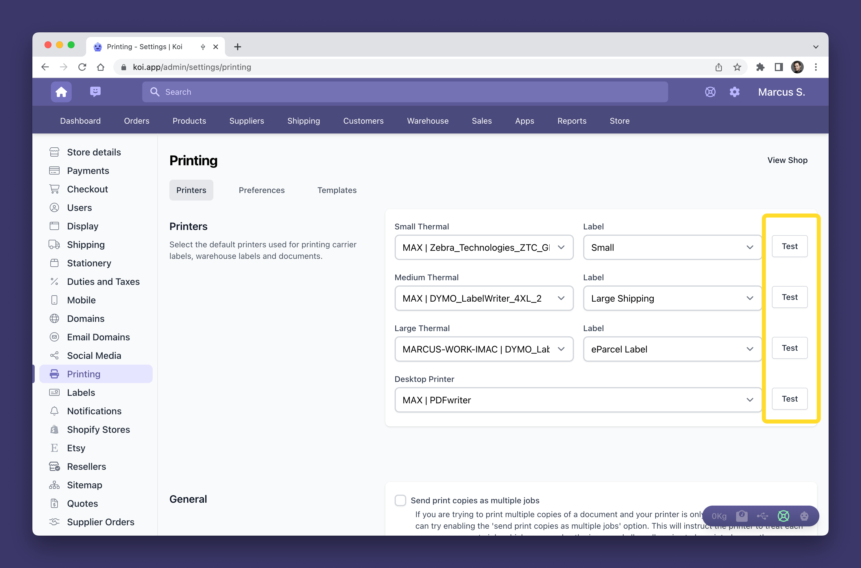 - You can test your printers connected to Koi by clicking the Test button next to each kind of printer.