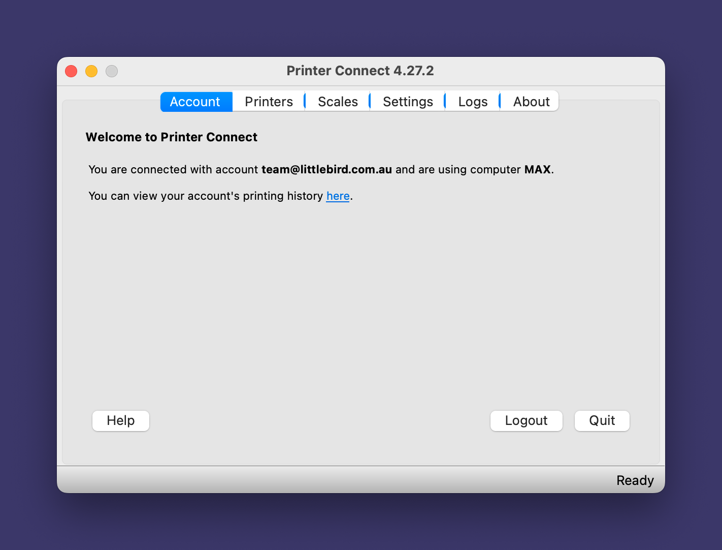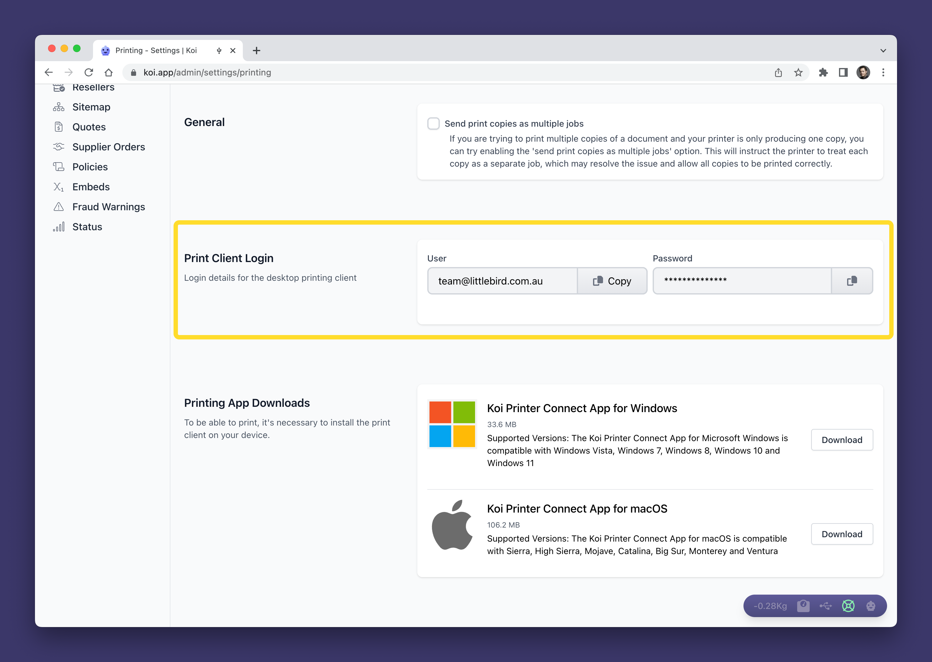 The login details for Koi Printer Connect are not the same as those for your Koi Account. These details are shared by everyone who uses your business' Koi Account, and are not specific to any one user. This means that multiple users on different devices can access the same printers, and you can even print from your mobile device.