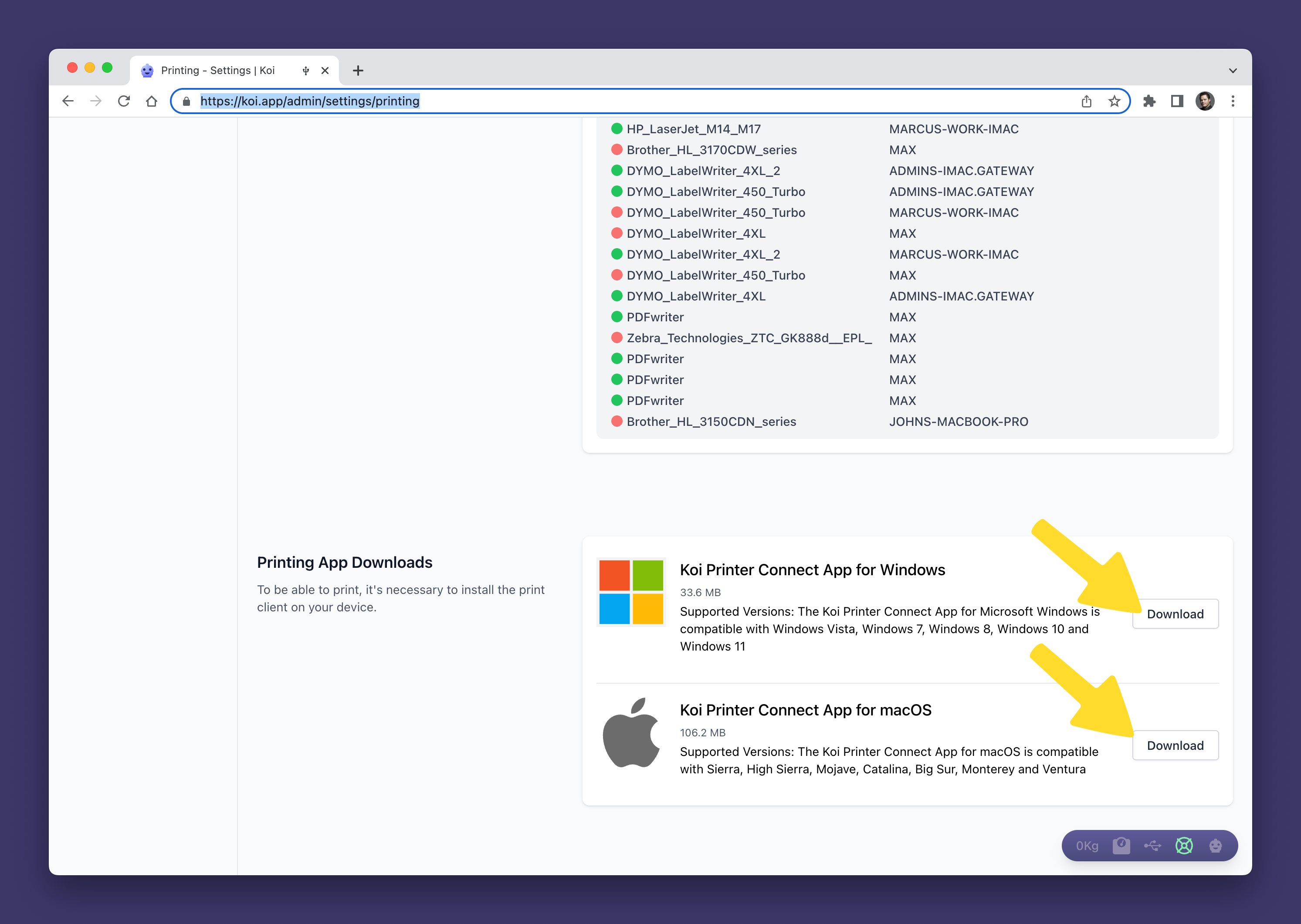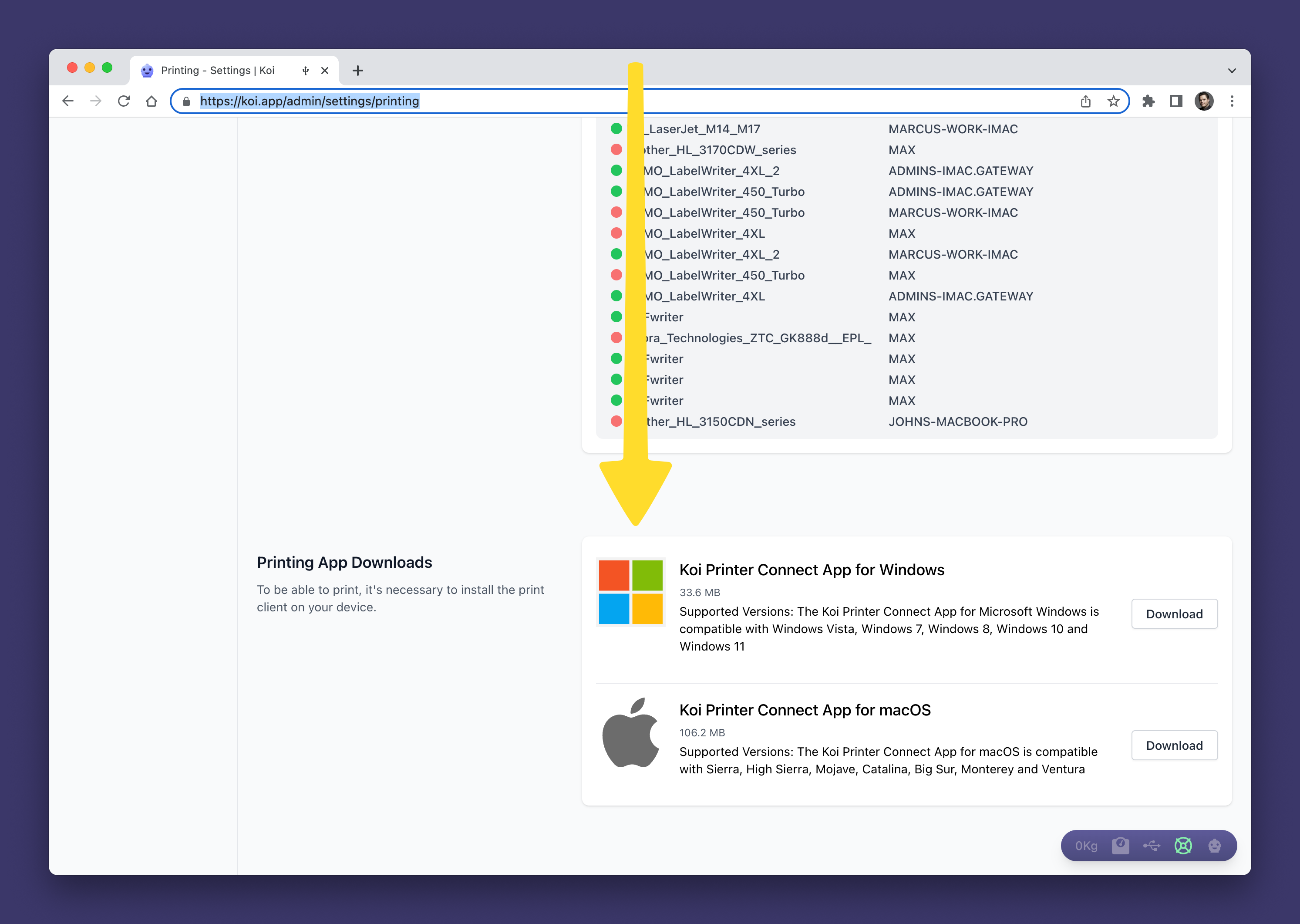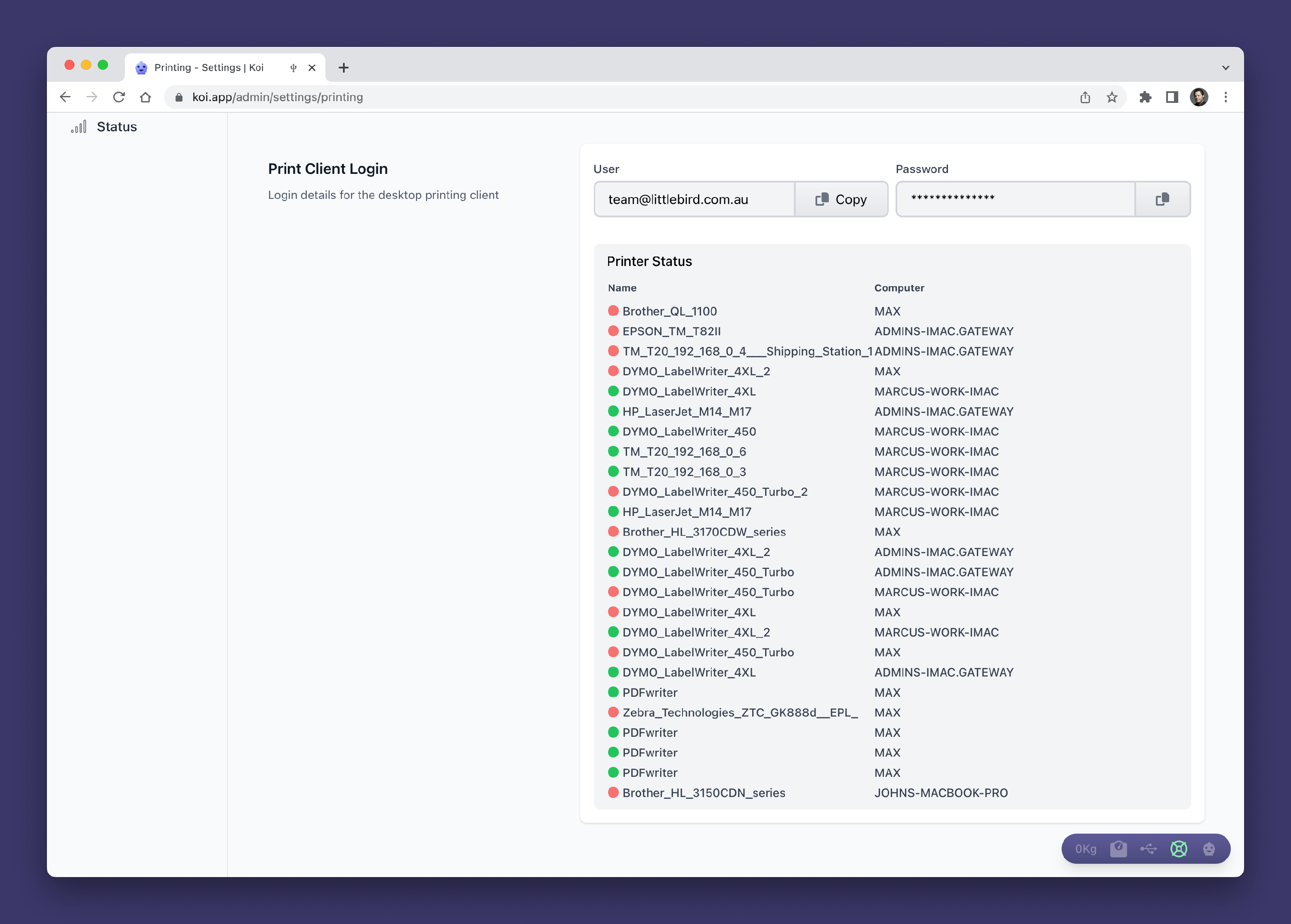 - After a few minutes the various printers connected to your computers with the Koi Printer Connect app running on them will be visible on the Printer Settings Page.