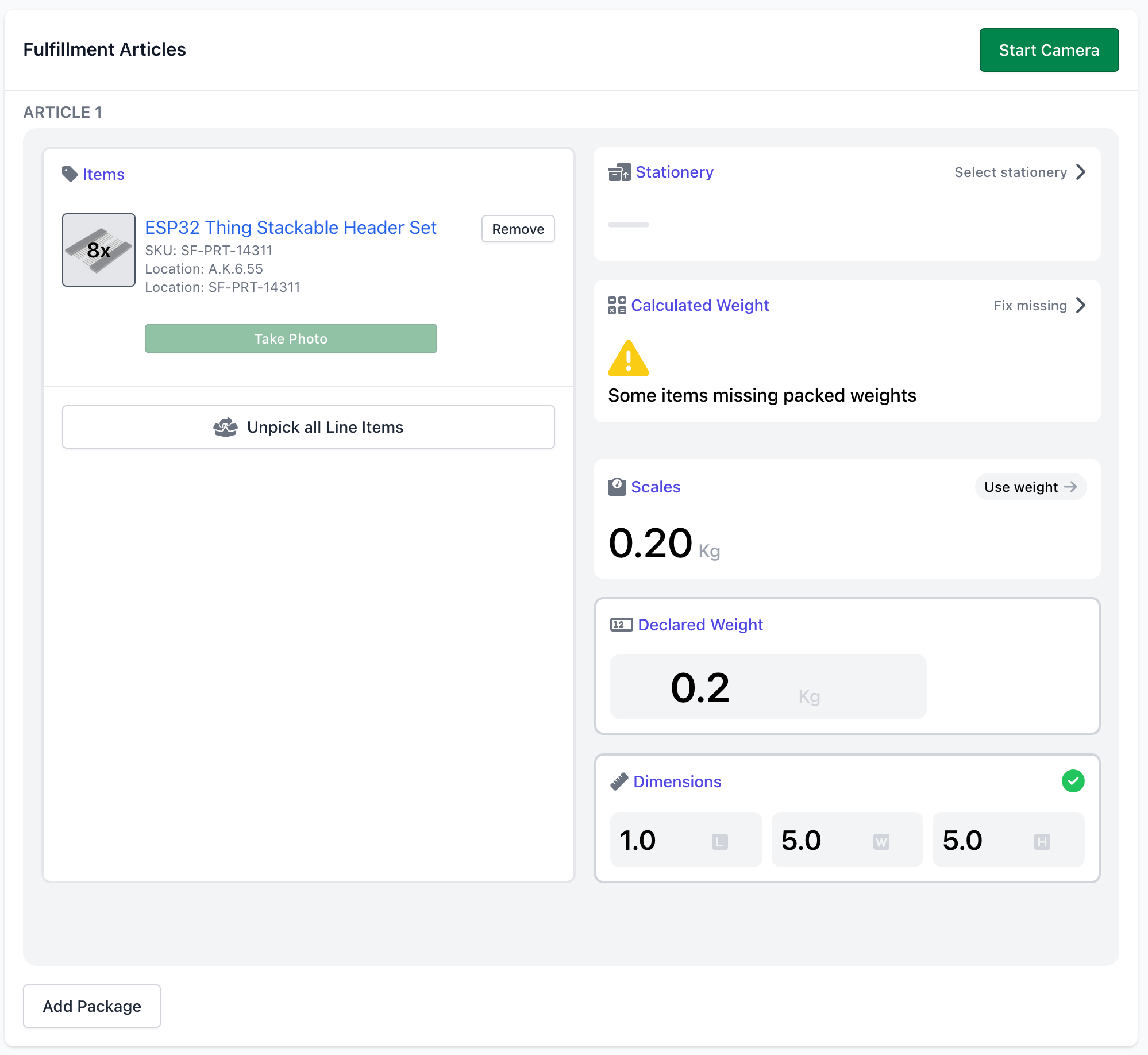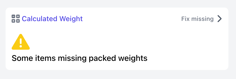 If some of the items in the Fulfillment Article are missing weights, you can add them by clicking Fix missing.