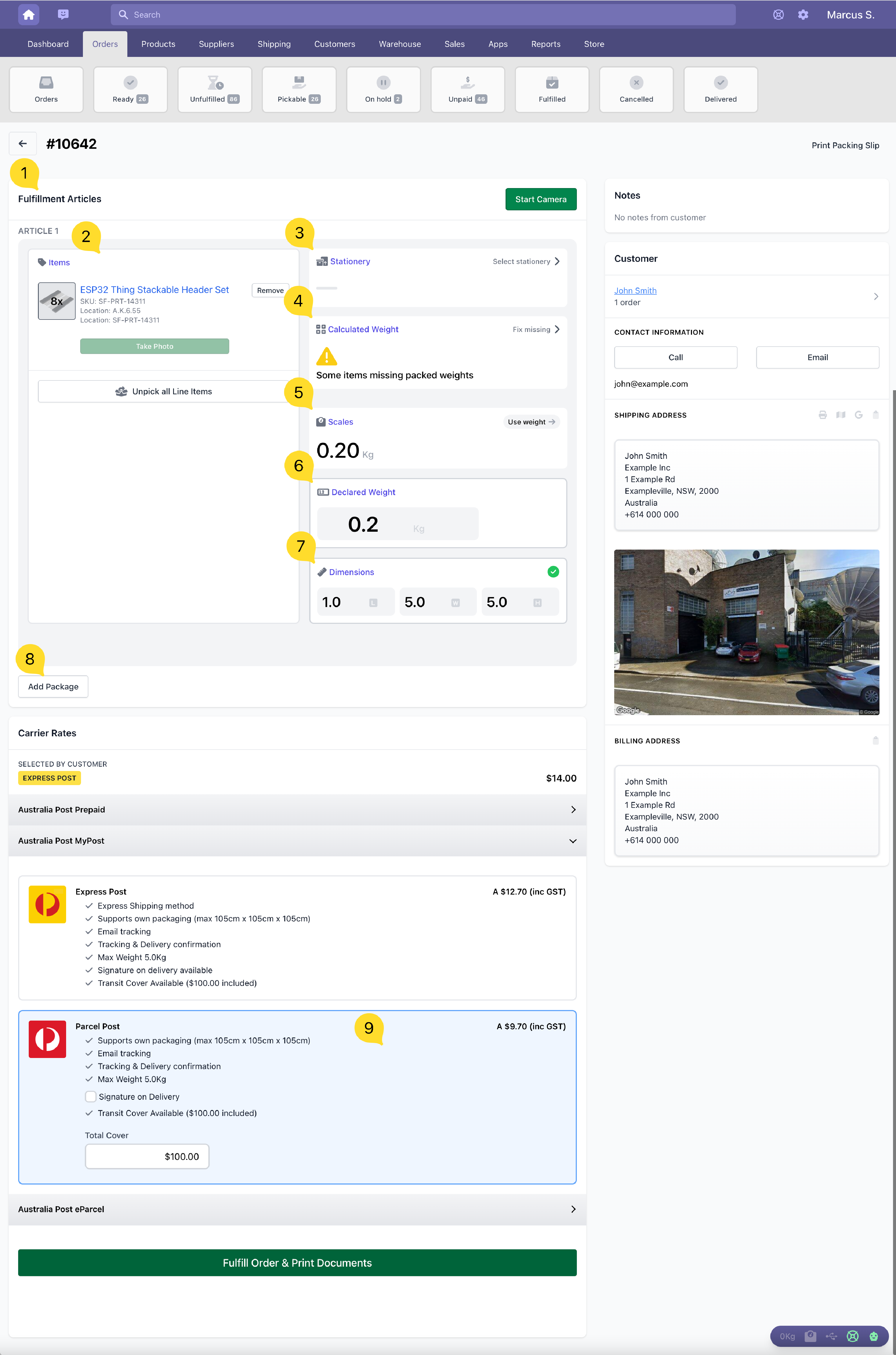The Add Package 8️⃣ button lets you add another Fulfillment Article to your Fulfillment. This allows you to ship multiple parcels in the same consignment. Note: Not all carriers support multi-parcel or multi-article consignments (e.g. Sendle).