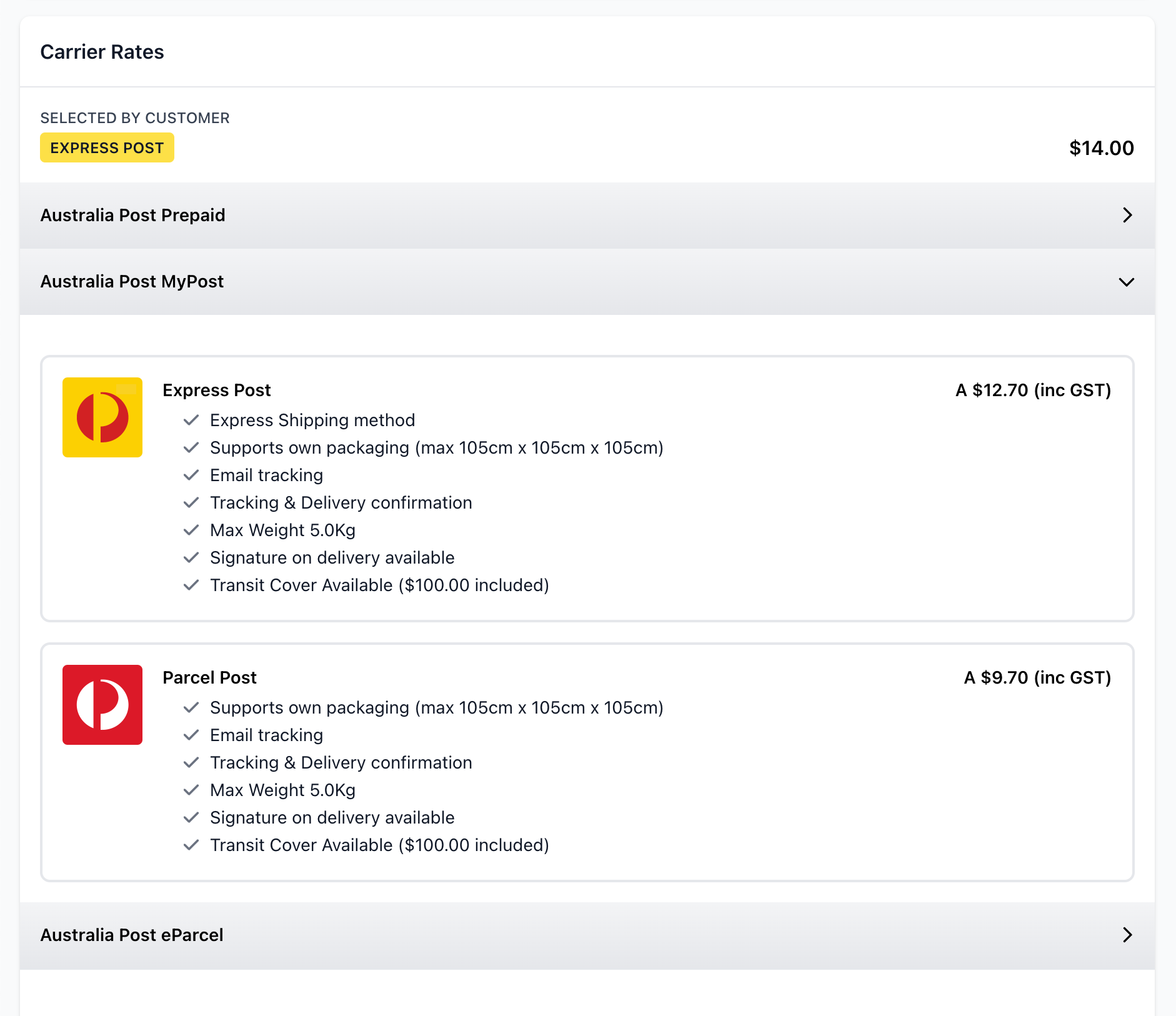 Shipping rates will be unavailable if your article is above or below the weight supported by your carrier, exceeding the dimensions supported by your carrier, exceeding other business rules provided by your carrier (e.g. parcel volume/cubic, mismatch in Suburb, State and Zip).
