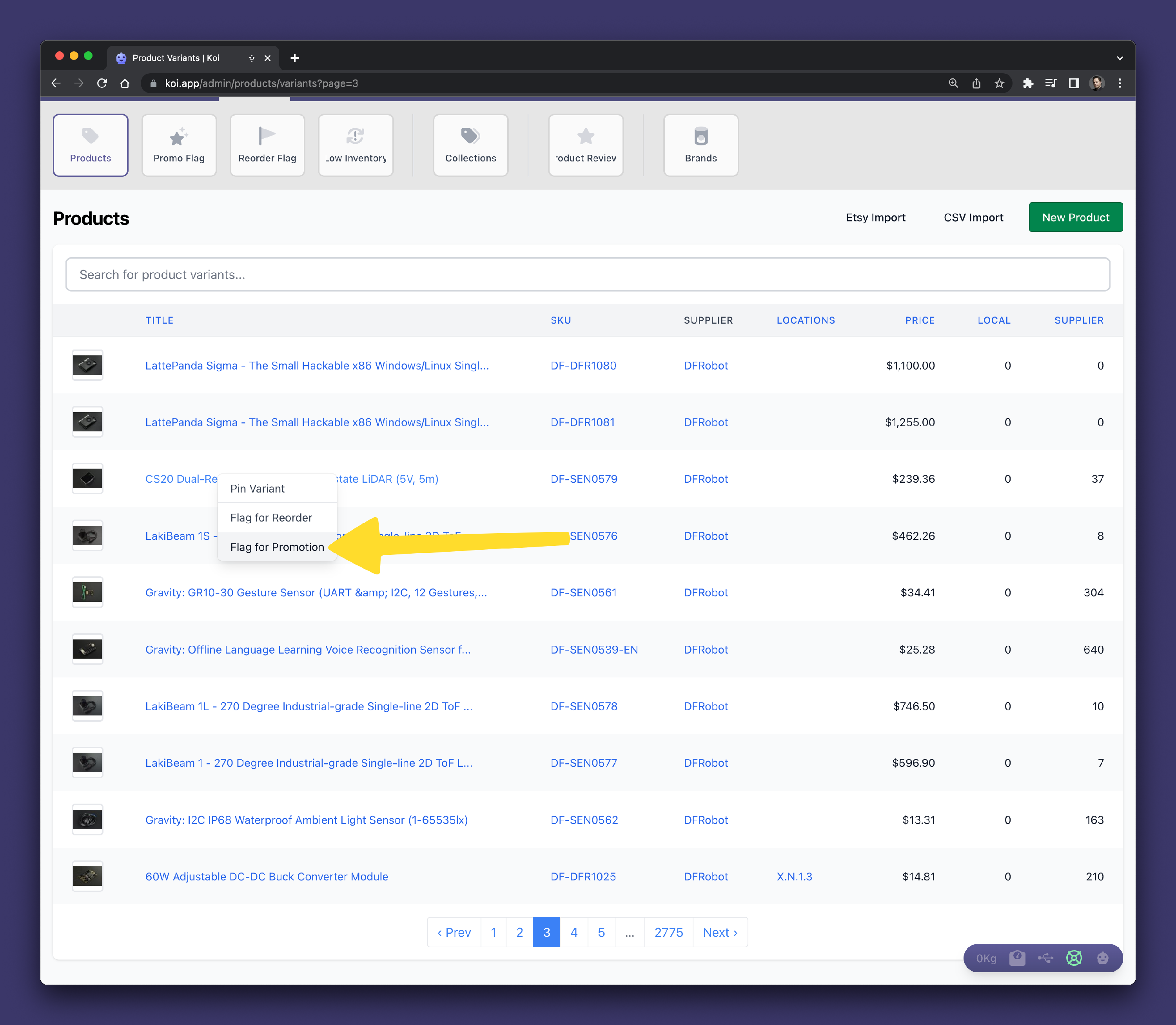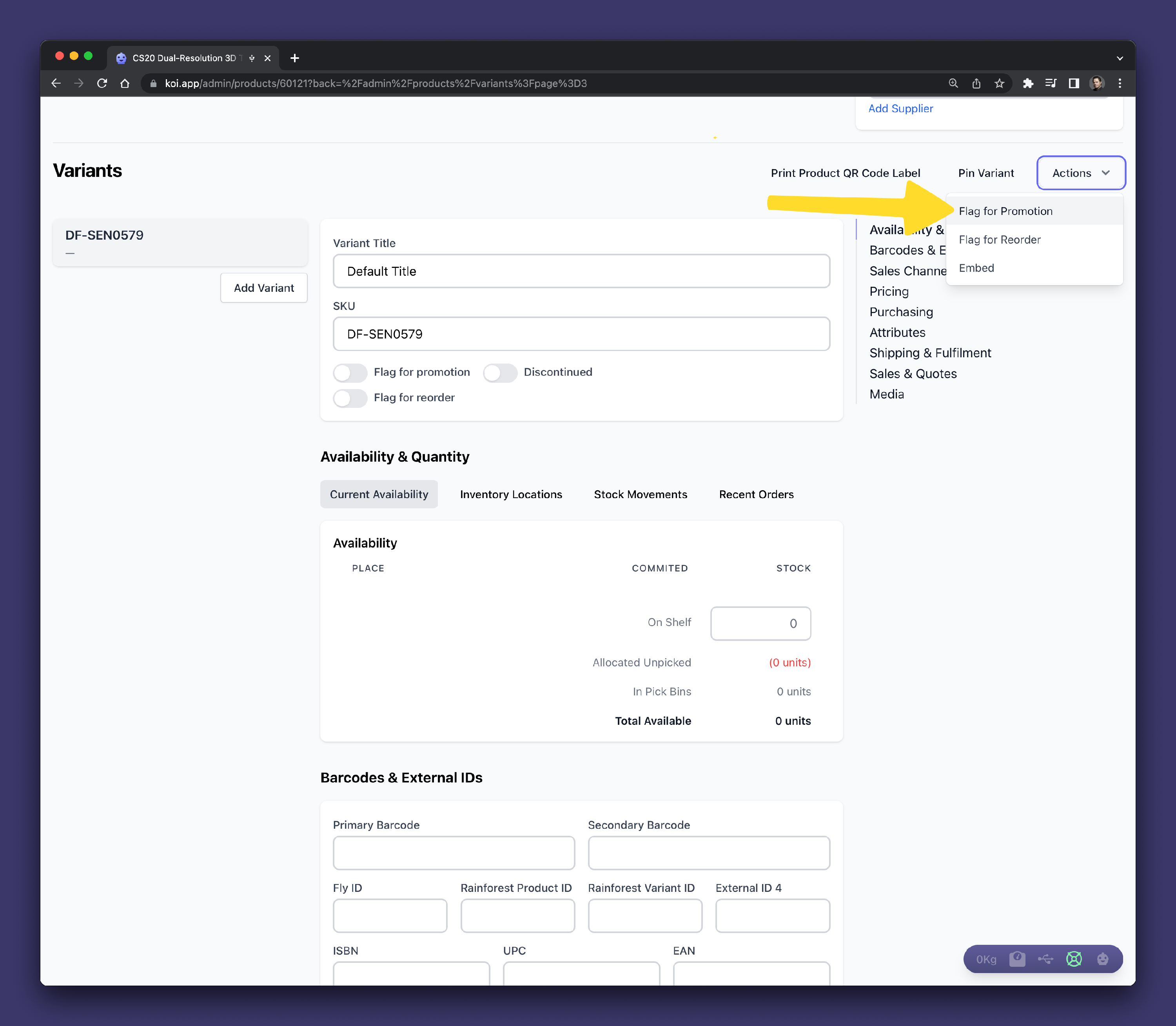 In the Koi Ecommerce management platform, merchants can utilize the promo flag feature to mark specific product variants for future marketing promotions. This guide aims to explain the purpose of the promo flag, its benefits, and provides step-by-step instructions on how to flag a product variant for promotion. By using this feature, merchants can easily identify and compile a list of products suitable for marketing campaigns, even when the inventory management and marketing responsibilities are handled by different individuals.