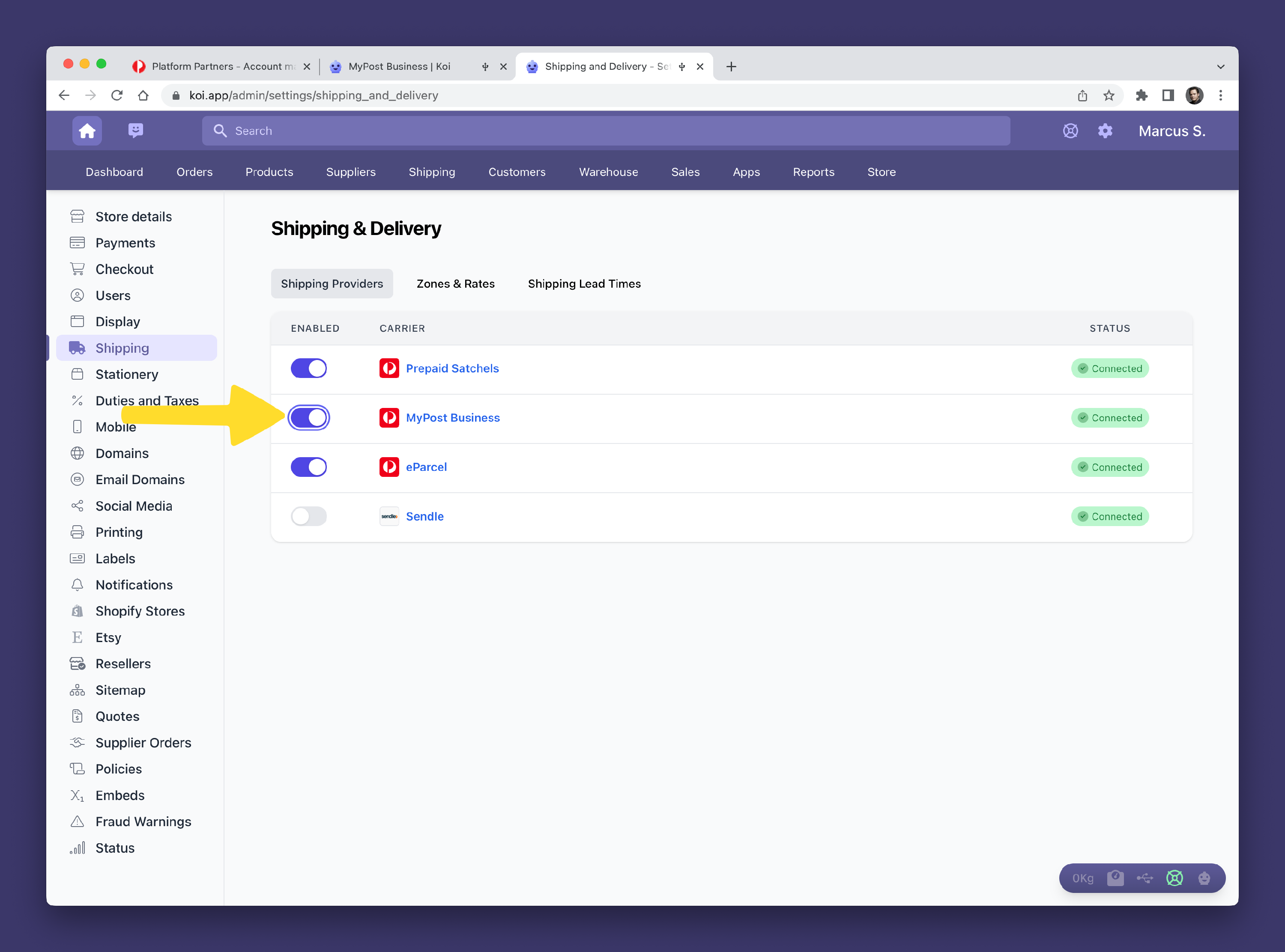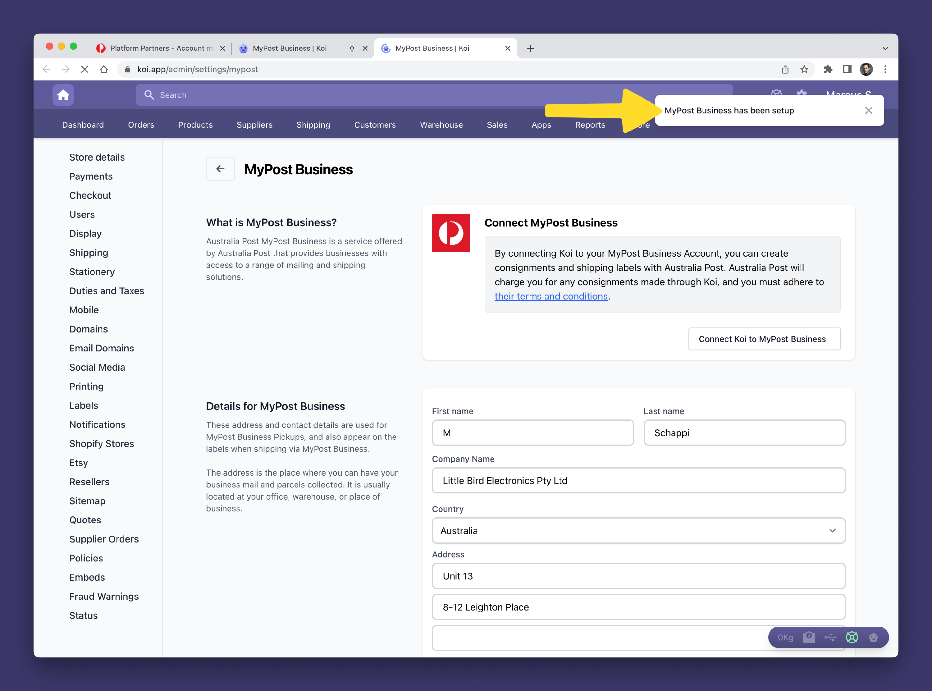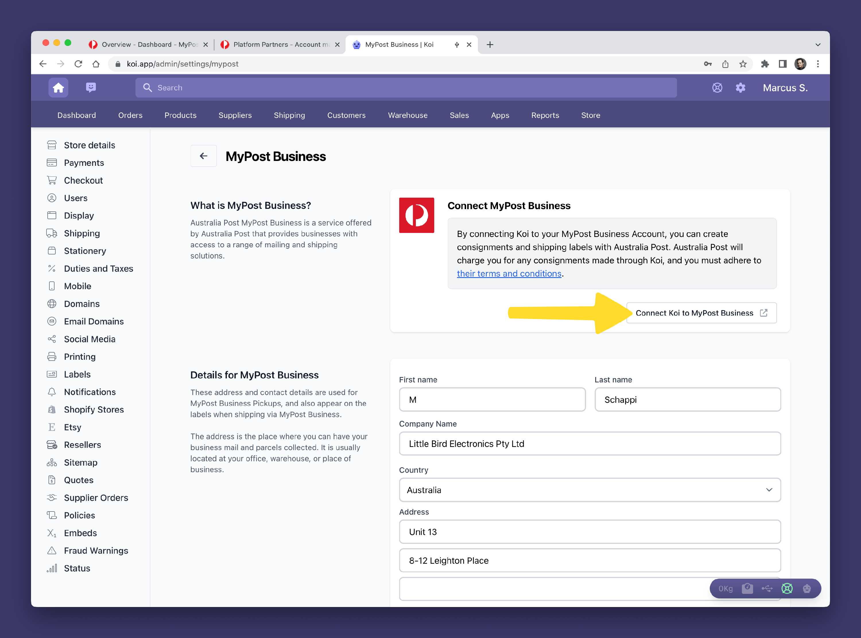 Step 2: Connecting Koi to Australia Post MyPost Business