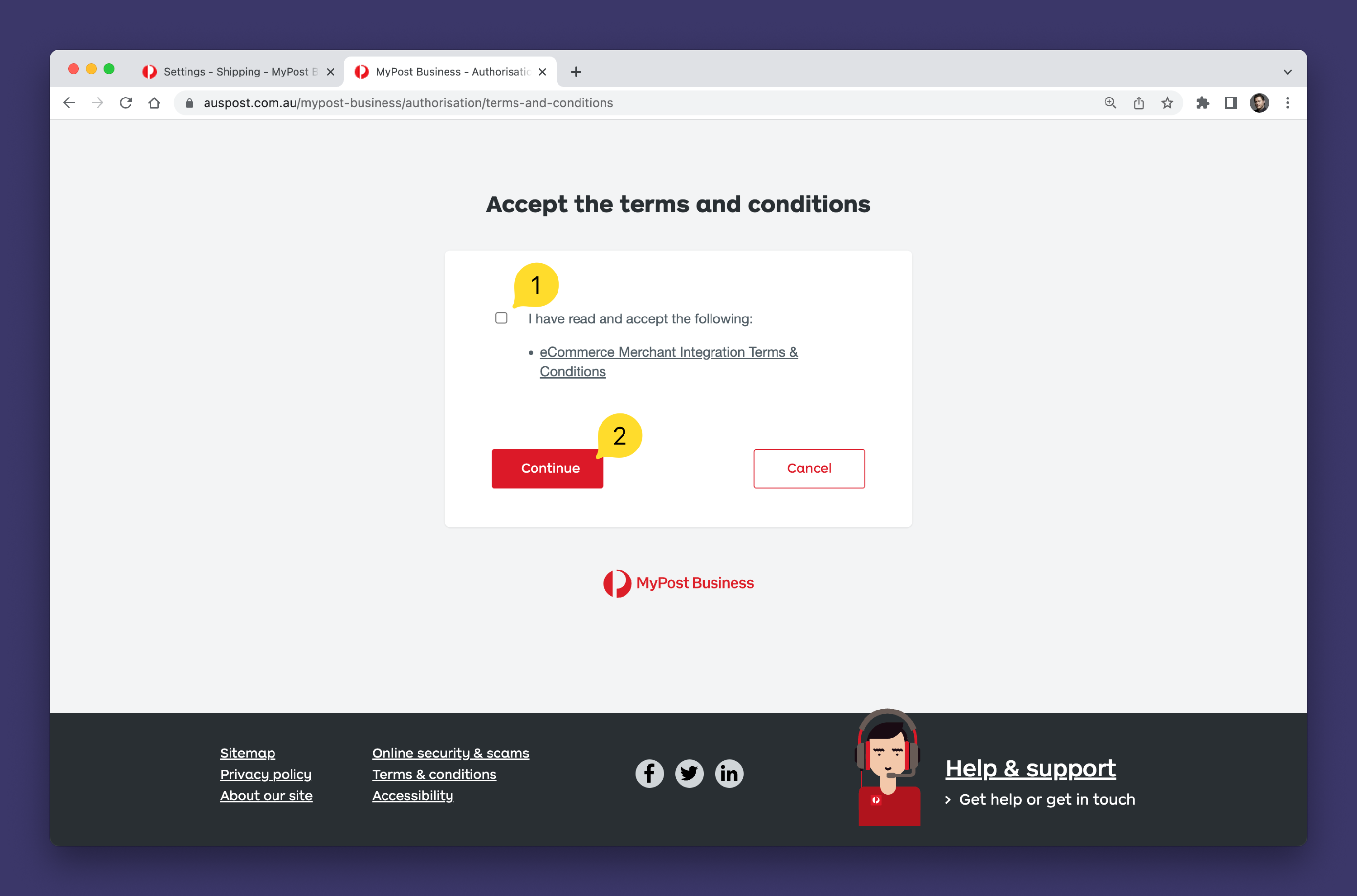 - Click the Checkbox 1️⃣ to accept the Australia Post terms and conditions