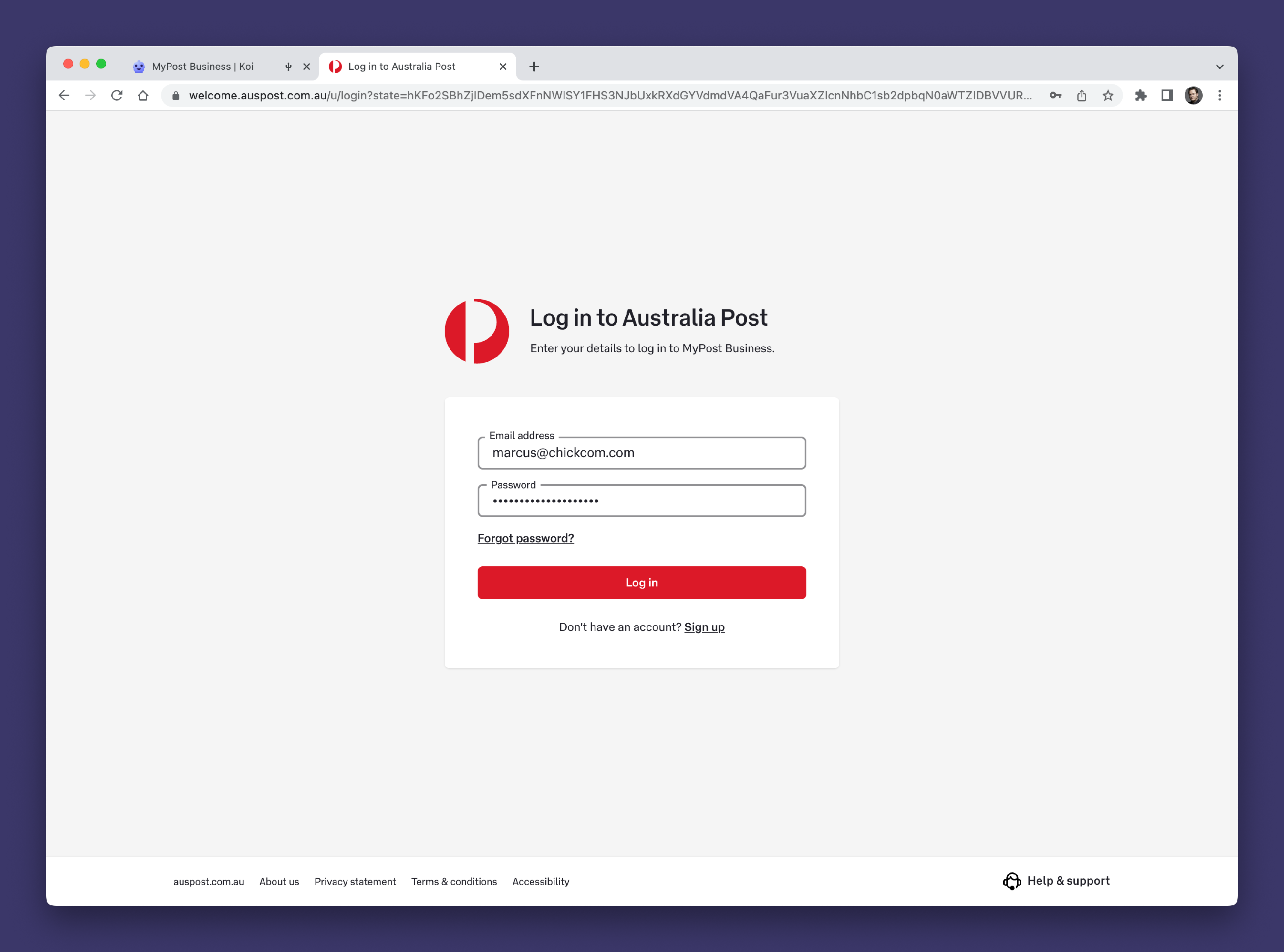 To connect Koi to MyPost Business we first need to log into your Australia Post MyPost Business Account.