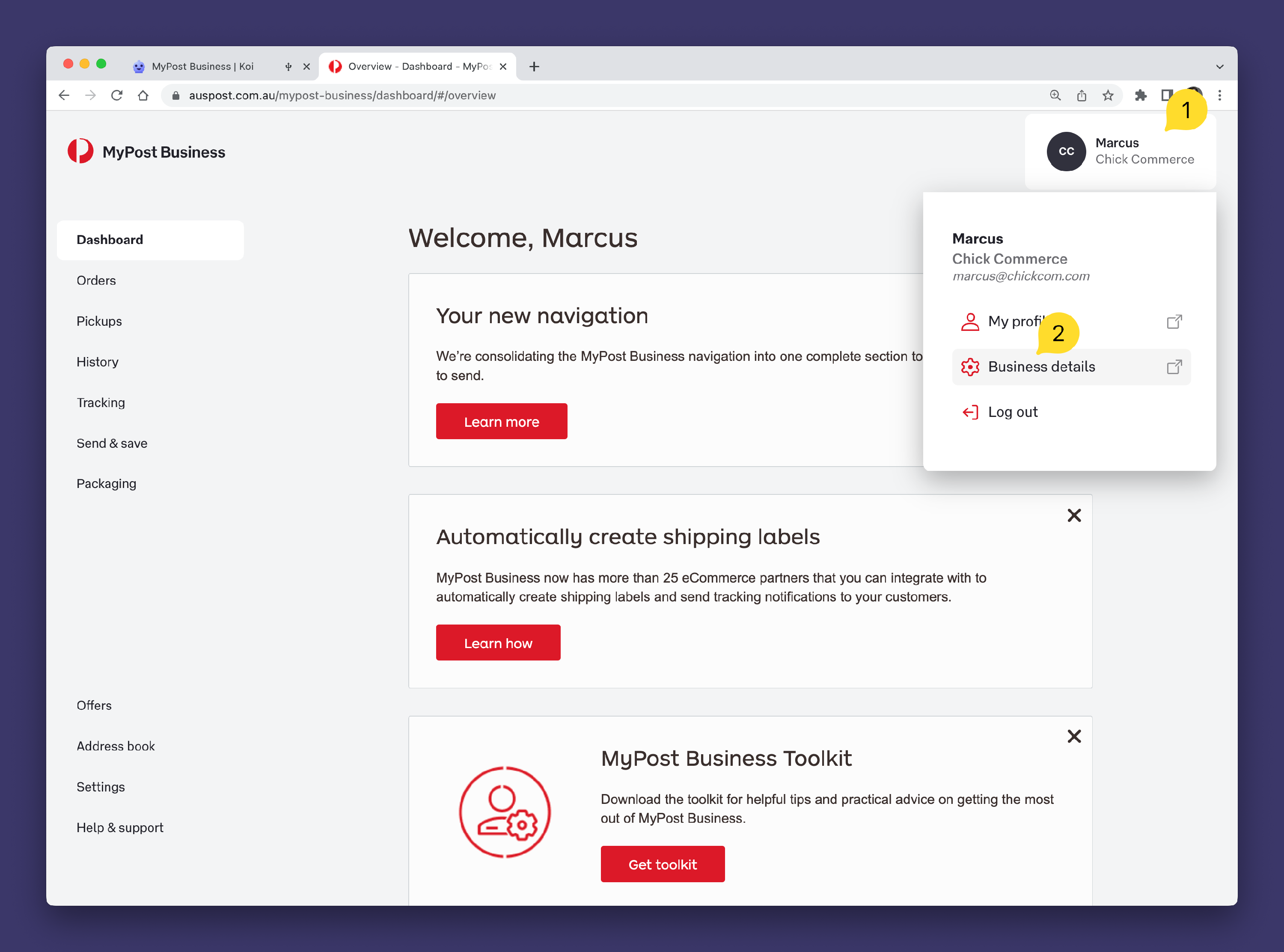 - Go to https://auspost.com.au and click Log in 1️⃣ and then MyPost Business 2️⃣