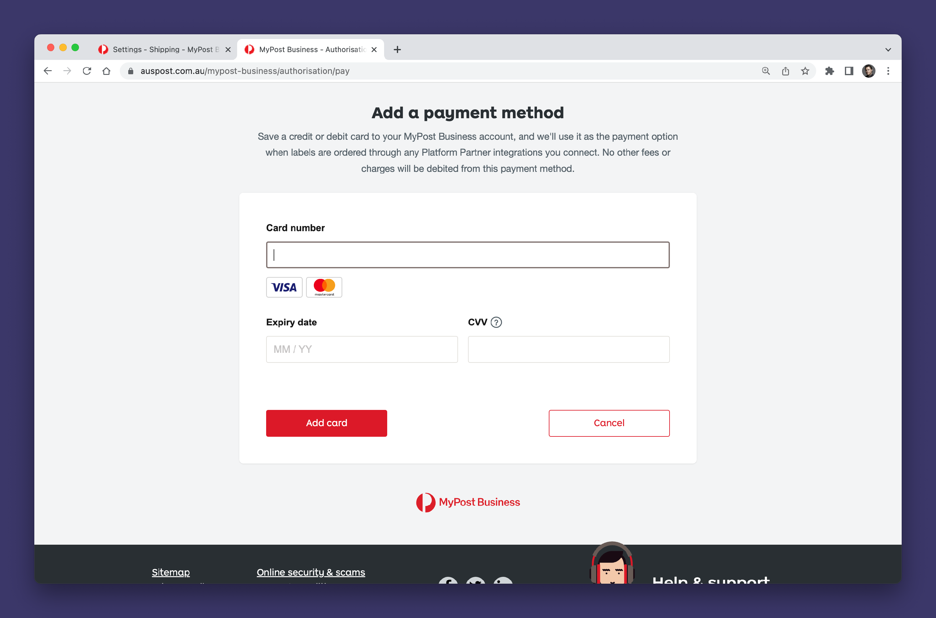 If you haven't added a payment method to your Australia Post account, Australia Post will ask you to add a credit card to your account. This is used for paying for MyPost shipments. The credit card details are not shared with Koi.