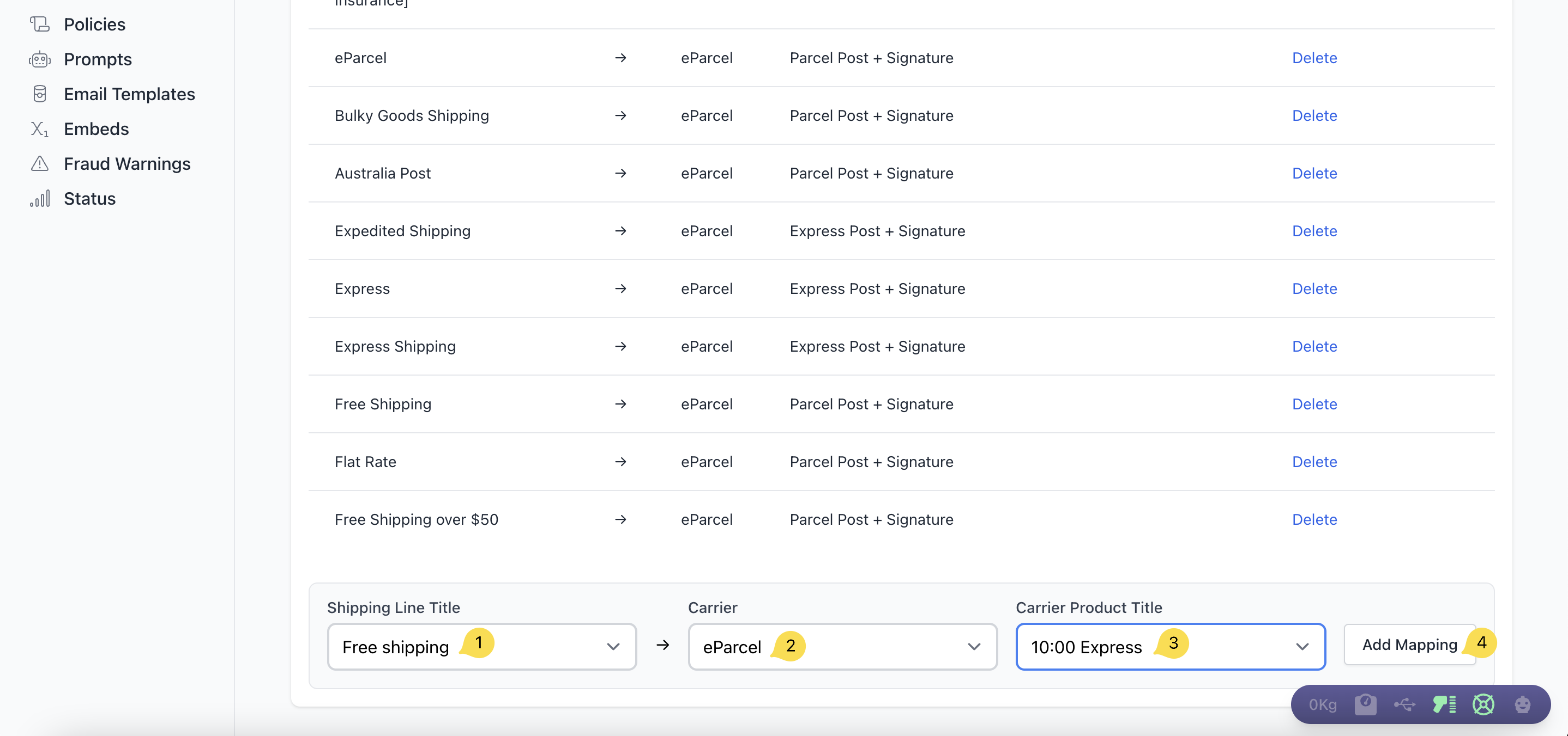 - Click on Add Mapping to create map a Shopify Shipping Method to Carrier Shipping Method