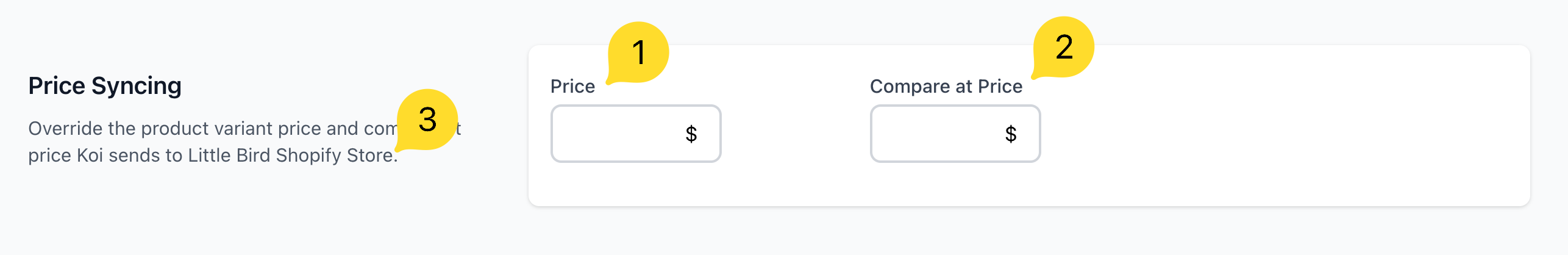 When a figure is entered in the "Price" field 1️⃣ or "Compare at Price" field 2️⃣, that amount will be sent to Shopify instead of the product variant's default prices.