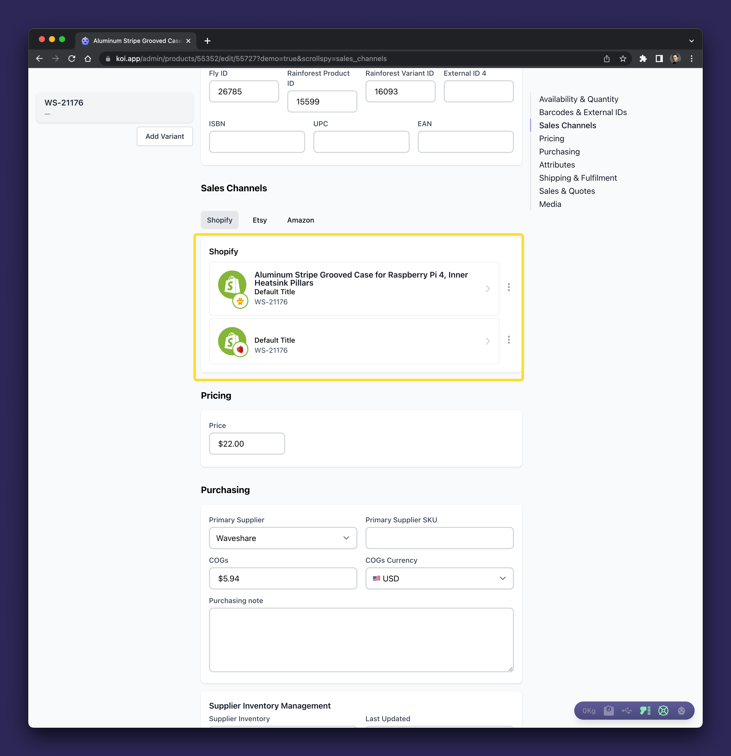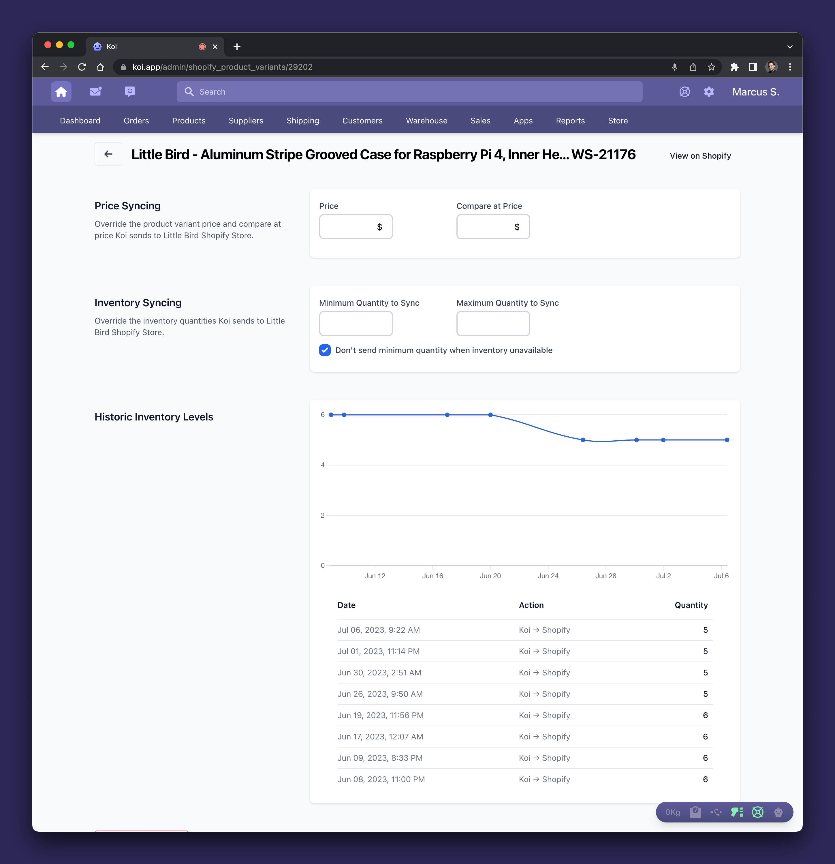- Koi can sync your inventory levels to multiple Shopify stores.