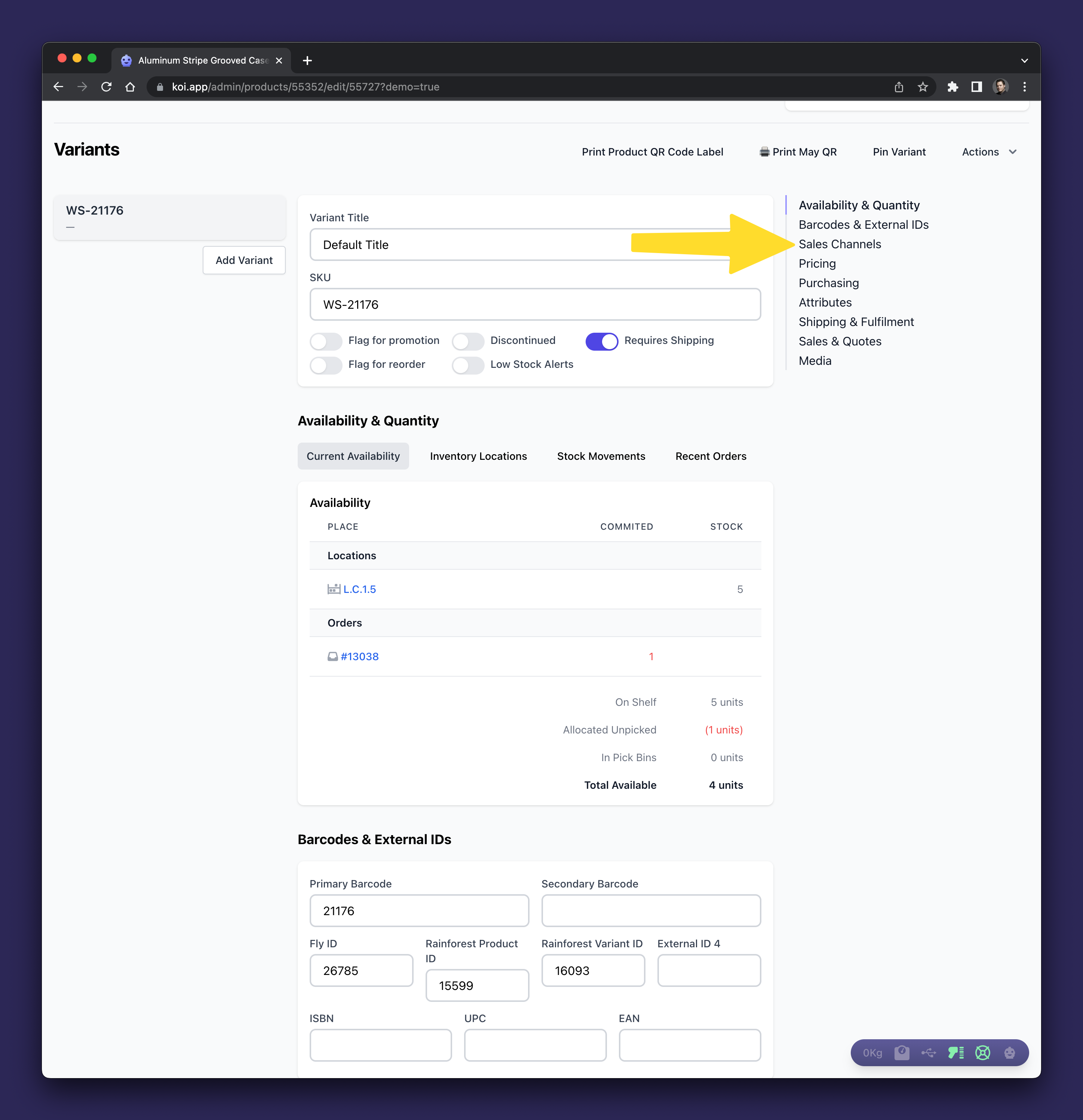 You can access the Product Variant's Shopify Settings page from the "Sales Channels" card on the Product Variant's page.