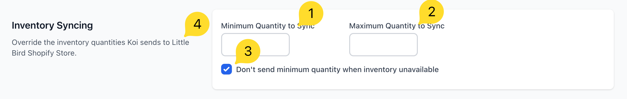 The "Minimum Quantity to Sync" field 1️⃣ ensures that Koi always sends a minimum quantity to Shopify, regardless of your inventory (unless you tick the "Don't send minimum quantity when inventory unavailable" checkbox) 3️⃣.