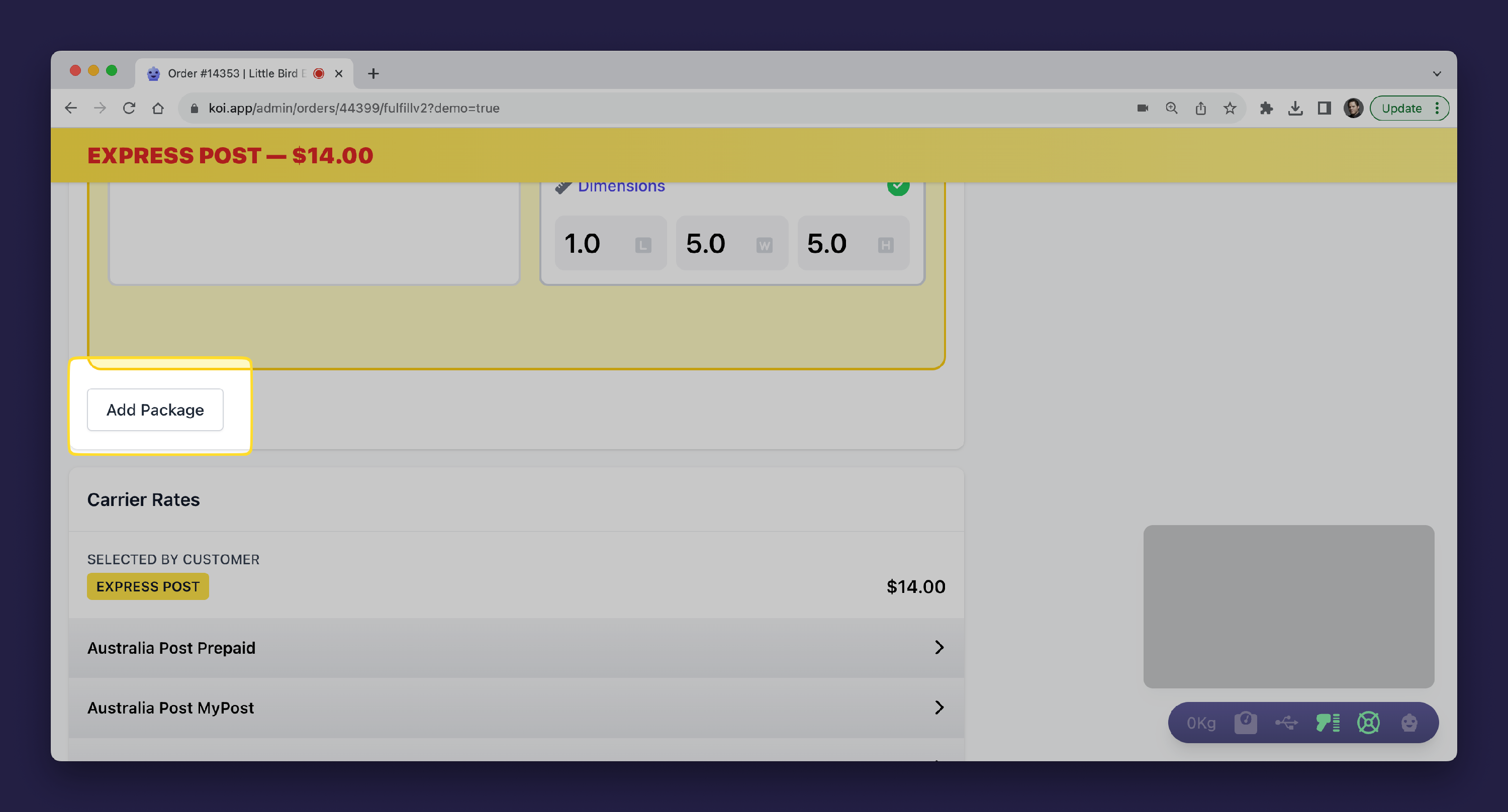 You can add another packing by clicking the "Add Package" button. This will add another fulfillment article to the fulfillment that is being sent out.