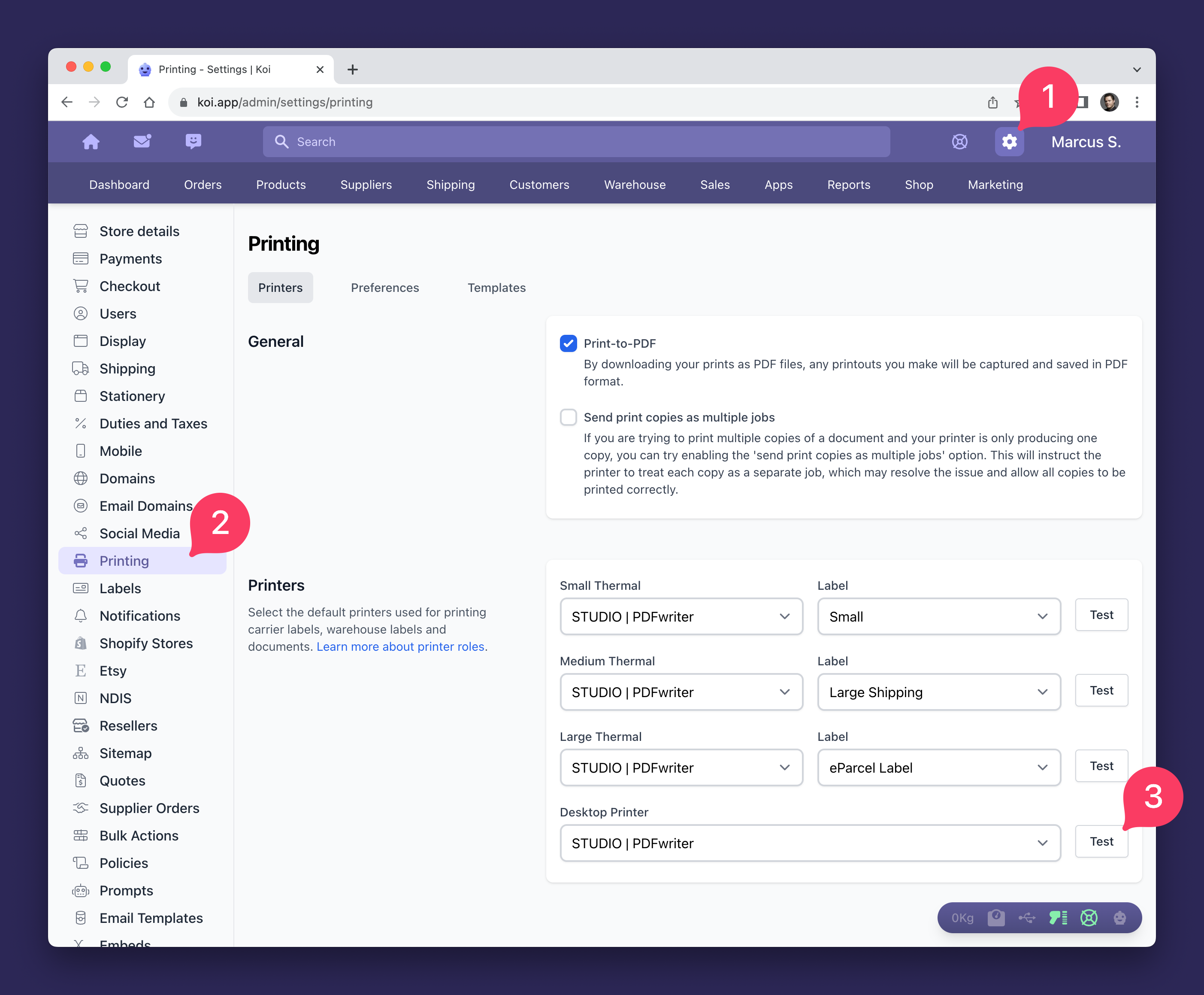 In Koi's printer settings, we provide a feature for sending test prints to your connected printers. This helps verify successful printing, identify necessary adjustments, and assist with troubleshooting unsuccessful print issues by printing a reliable document.