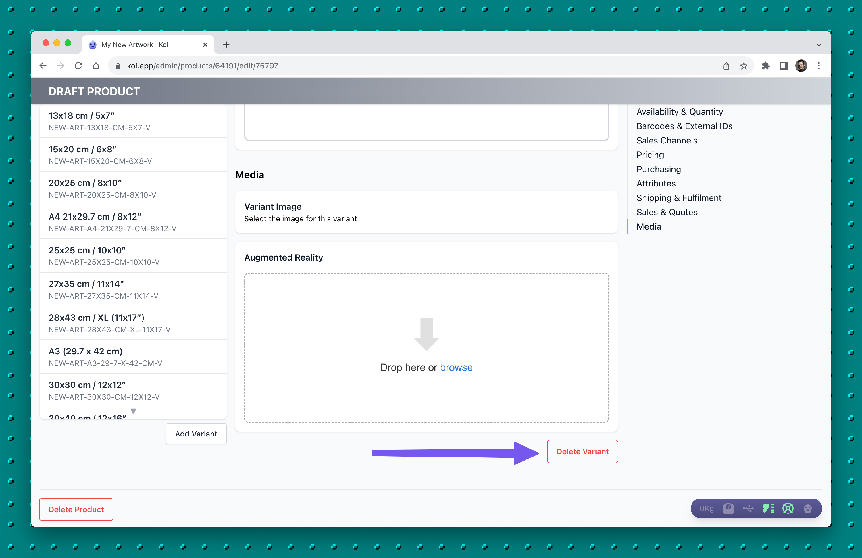If a product only has one variant (as all products initially do), the "Delete Variant" button won't be visible. Additionally, if the Variant hasn't been saved or if "Sync Deletions" isn't activated on your linked e-commerce platforms, the button remains hidden. This precaution prevents the product from being inadvertently reimported into Koi.