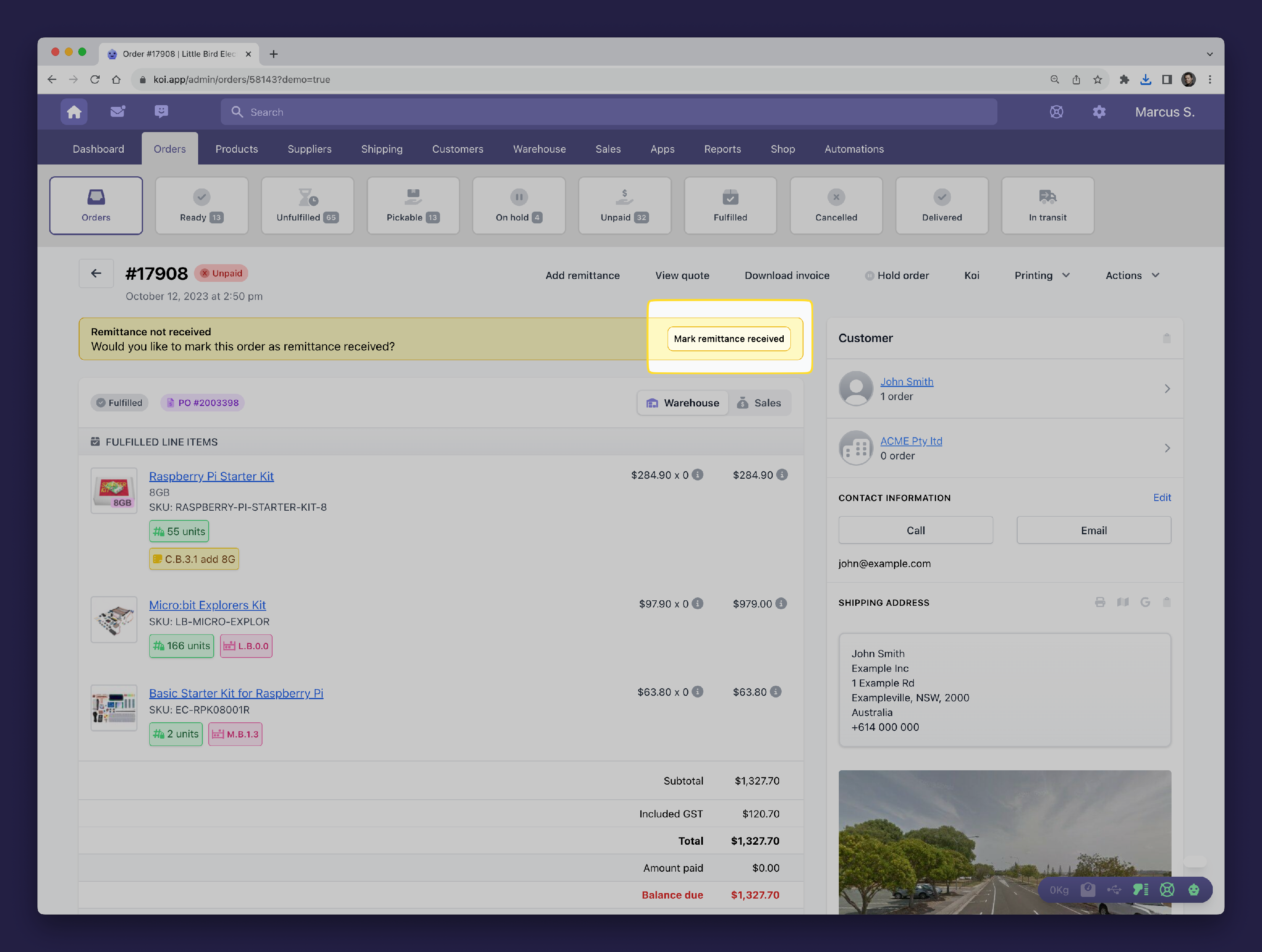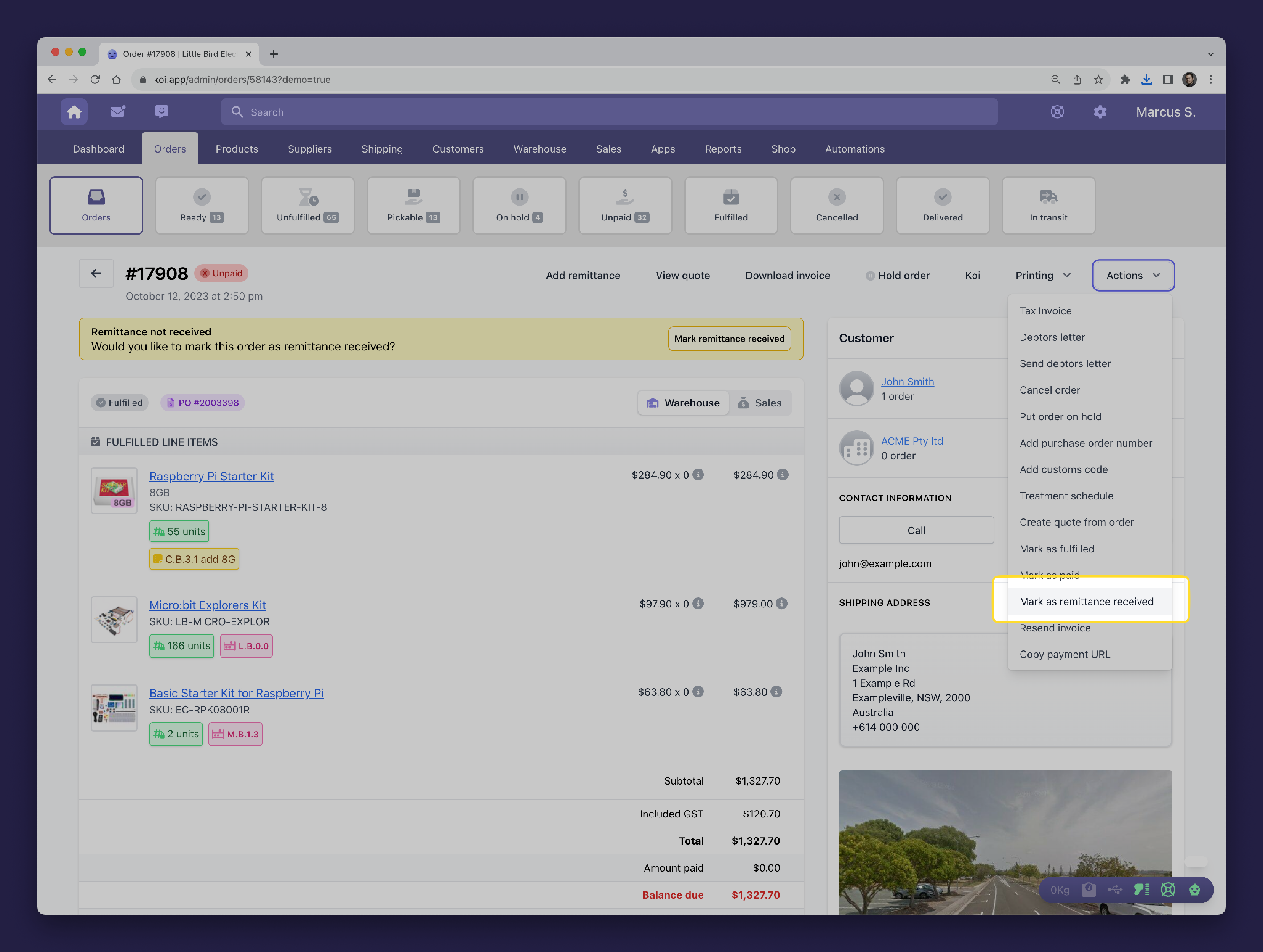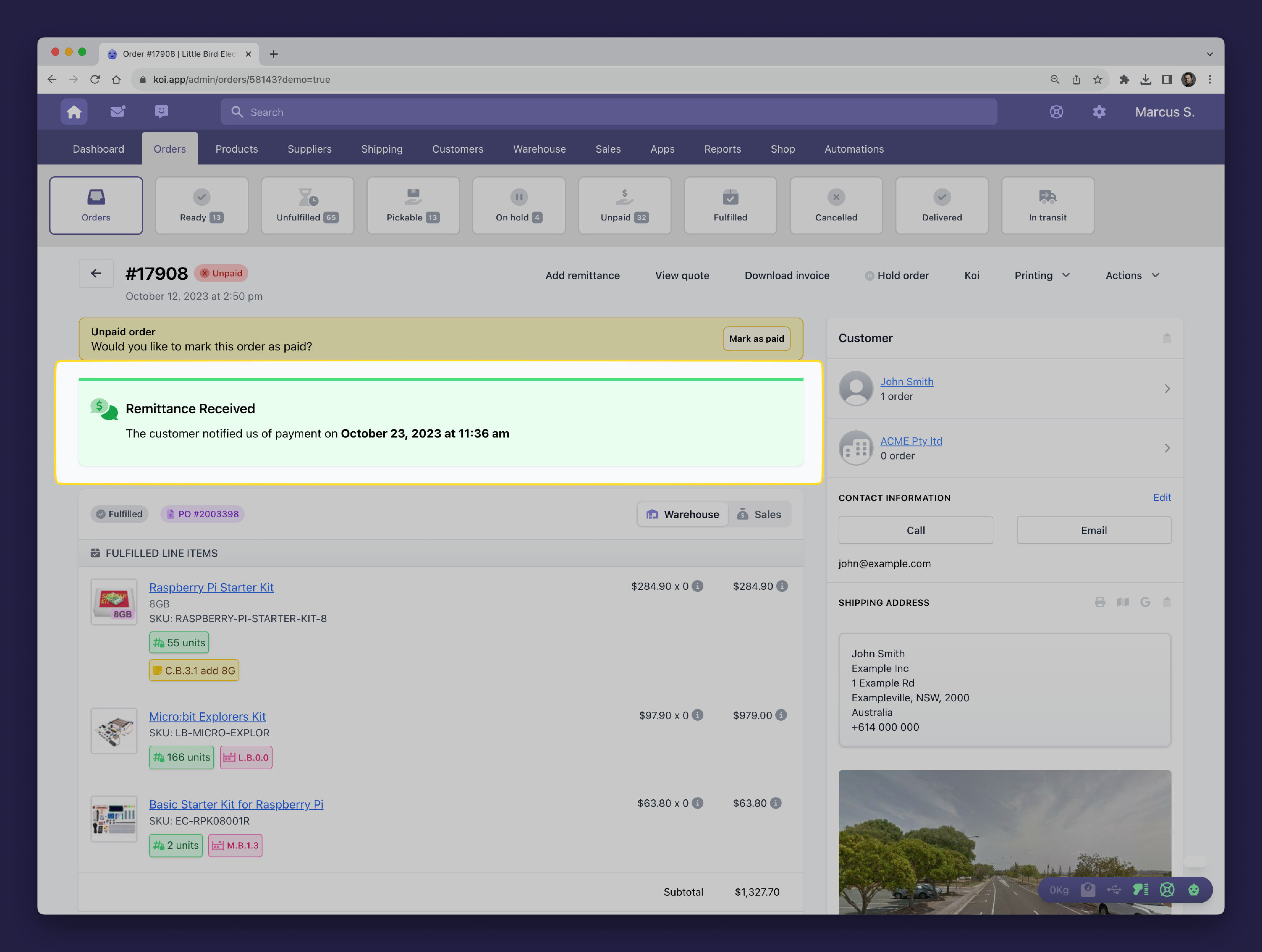 You can also indicate that you've received remittance by using the contextual banners at the top of the orders page. These banners aim to suggest the next most logical action you might take. A remittance banner will appear when an order is unpaid and no remittance has been received previously.